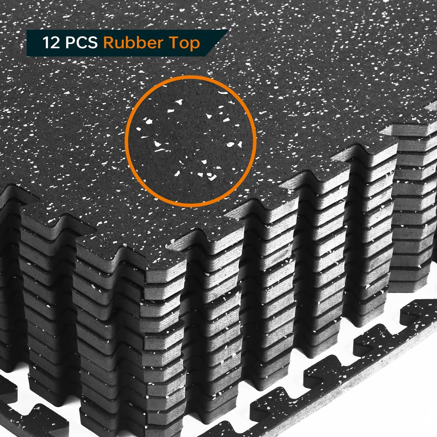 0.56 Inch Thick Gym Flooring for Home Gym with Rubber Top - 48 Sq Ft Interlocking Gym Floor Tiles - Workout Equipment Vibration Reduction Mats - 12 Pcs 24 x 24in Tile, Black & White