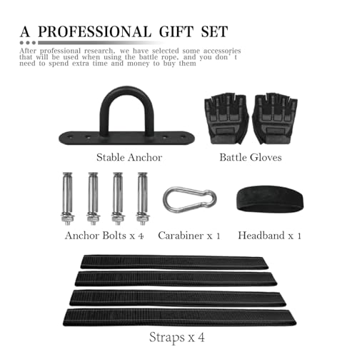- Workout Rope Includes Gloves and a Sweat Head Towel as a gift: In order to prevent palm bruises or calluses, we gave gloves as gifts. We also added sweat towels to the package to make the gym rope more convenient for you to use. Stable anchor, Anchor Bolts*4, Straps*4, and Carabiner are also presented in this package.