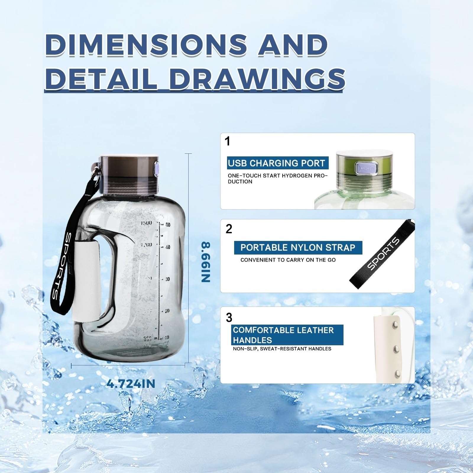 - 1.5L LARGE CAPACITY: With a large capacity of 1500ml hydrogen water bottle. It can easily meet your daily needs. The cap is equipped with a thick sealing ring. Leak-proof and durable. Stronger seal, hydrogen concentration is maintained.