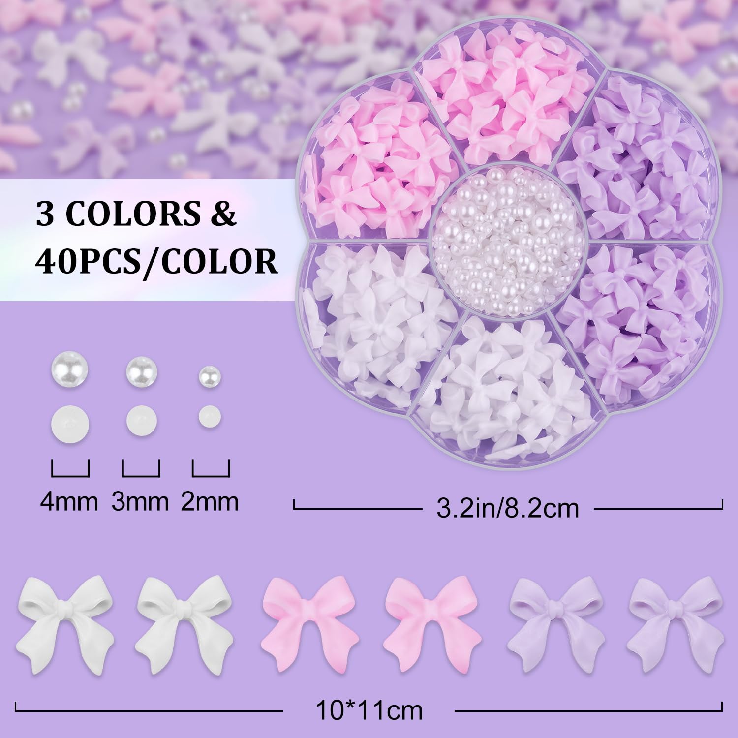 - 🎀 Great Amount: The nail bow charms are in 3 colors: White, Pink, Lilac, and divided into 6 grids by color. There are about 20 pcs of nail bow charms in the grids, approx. 120 pcs in total. This nail jewel set also comes with a grid of 2-4mm white nail pearls. It is a great amount and enough for you to design your special nail art style.