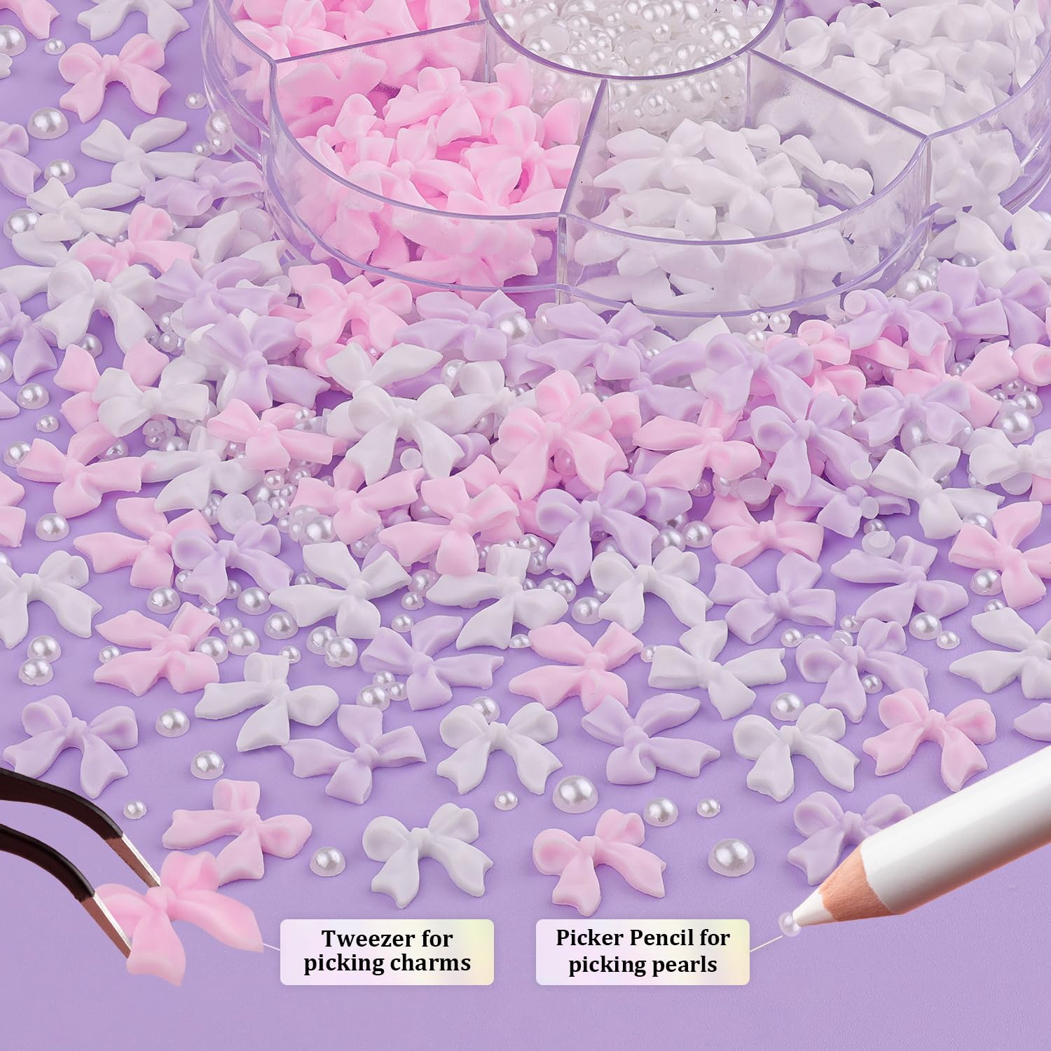 - 🎀 Package Contain: A box of bow nail charms and flatback pearls for nail design, a tweezer and a picker pencil to pick up the bow charms and small beads.