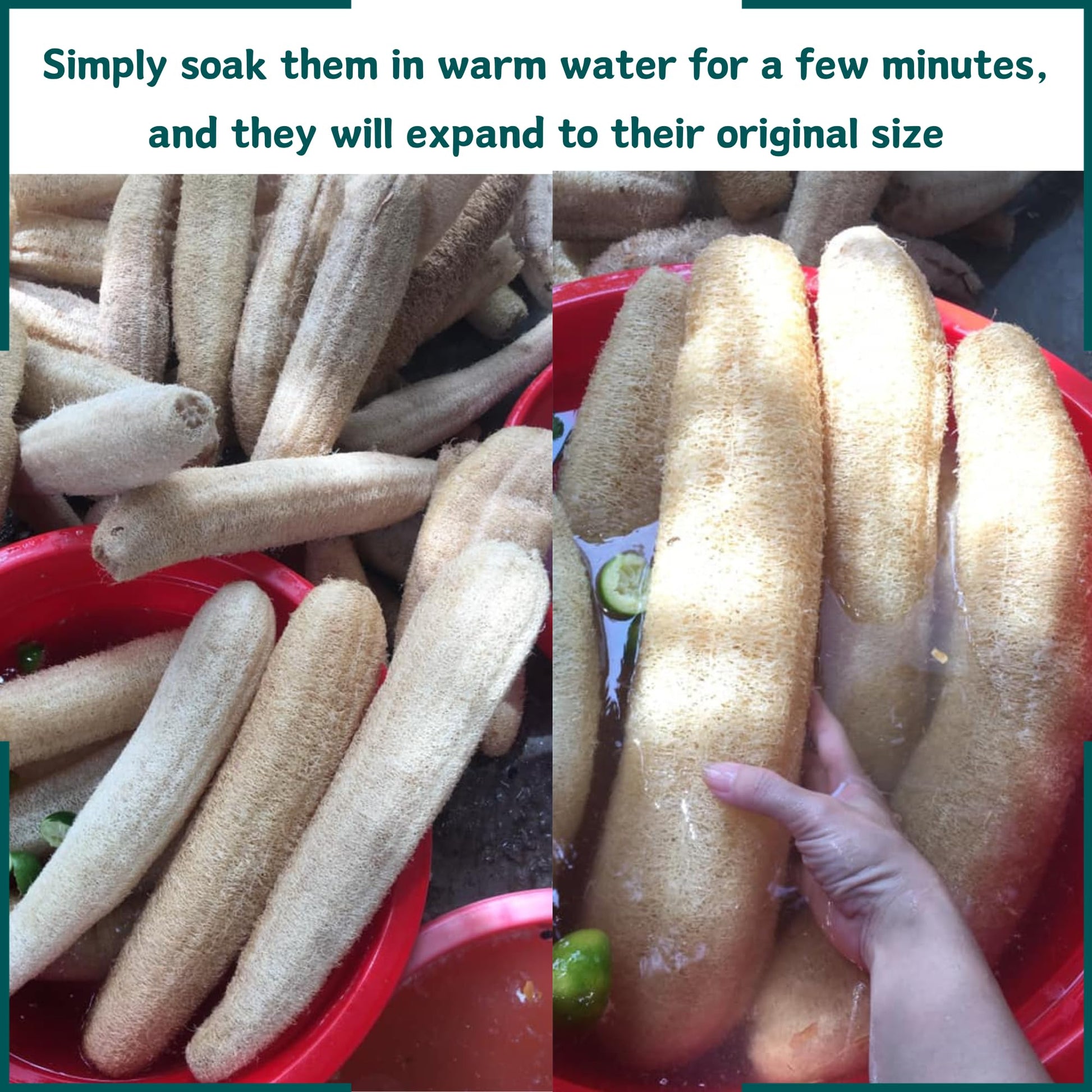 - A Set of 5 Loofah Exfoliating Body Scrubber: This loofah pack is designed to last for over a year with each mens loofah typically providing up to 3 months of use. Each whole natural loofah measures approximately 10 to 12 inches in size. The loofah pack are shipped in a compressed flat form and should be soaked in water before use. Additionally, we provide a full range of sizes, from large loofah to mini loofah travel size.