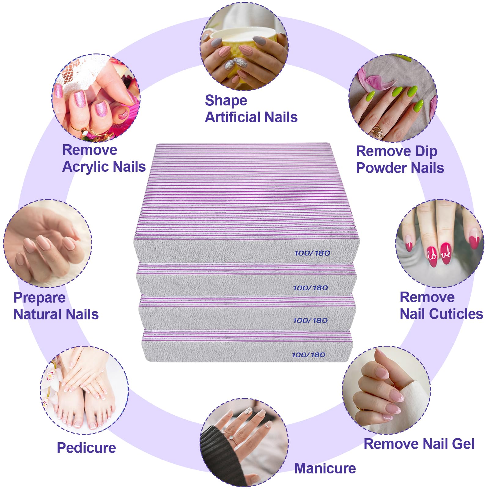 - 100/180 Grit Dual-Sided Nail Files: Each package contains 12 double-sided nail files, with one side featuring a coarse 100-grit texture, ideal for acrylic and thick nails, while the other side boasts a fine 180-grit texture, perfect for buffing away nail surface imperfections or refining natural nails.