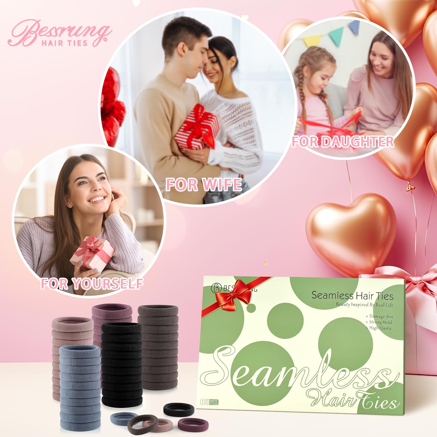 100 Pcs Thick Seamless Hair Ties, Ponytail Holders Hair Accessories No Damage for Thick Hair, Valentine's Day Gifts (Natural Colors)