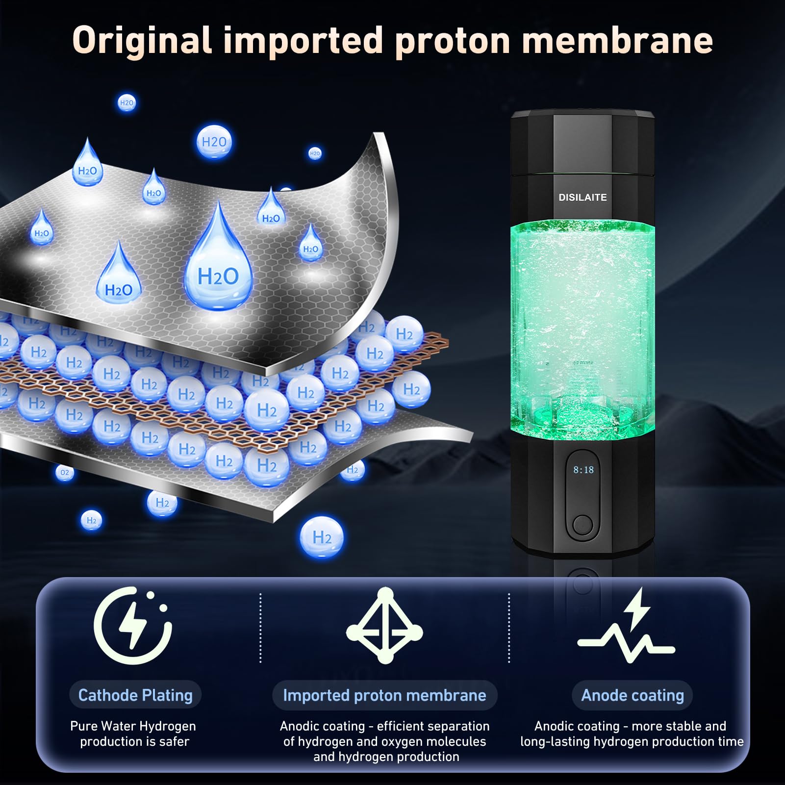 - Advanced Technology: DISILAITE hydrogen water bottle adopts SPE and PEM technology, special physical electrolysis technology, which can generate clean and high concentration hydrogen. And platinum has been added on both sides of the proton membrane, which make the water cup safer.Original imported proton membrane, technology originated from Japan but excceed Japan technology