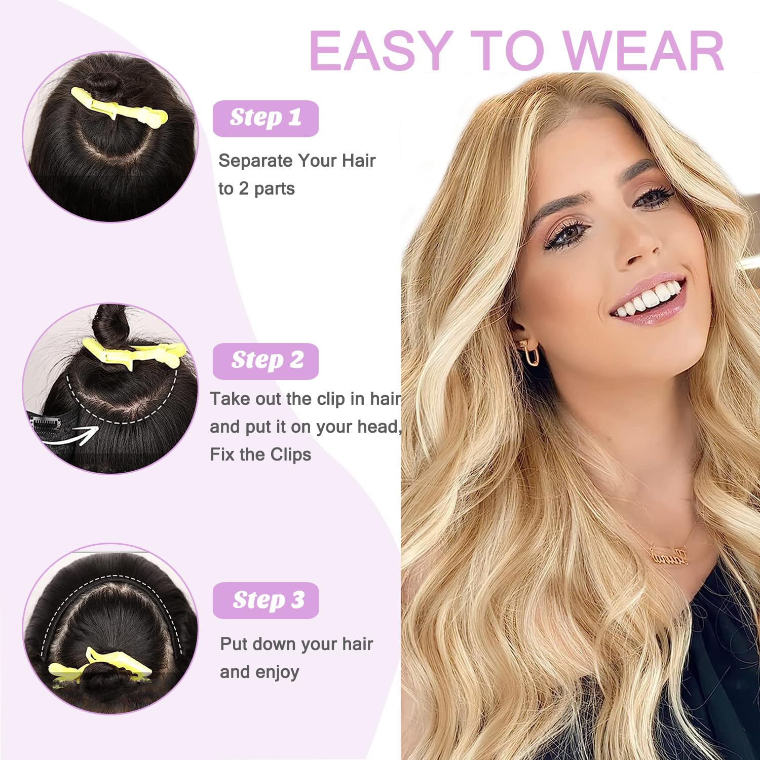 - 【Ways Of Wearing】Position The Clip Hair Extensions On Your Head Like A Headband, Secure Them With 5 Clips , Only Use 5 Hair Clips, Suitable For Customers With Soft And Sparse Hair On The Top Of The Head.Instant & Convenient Way To Add Volume. After Teasing Your Hair, You Only Need To Clip The Hairpiece In Your Hair, Then A Couple Of Pins To Secure It, And You Could Even Wear It High On Your Head Or Wrapped Low Towards The Nape Of Your Neck Or Wrapped In A Bun Or A Ponytail.