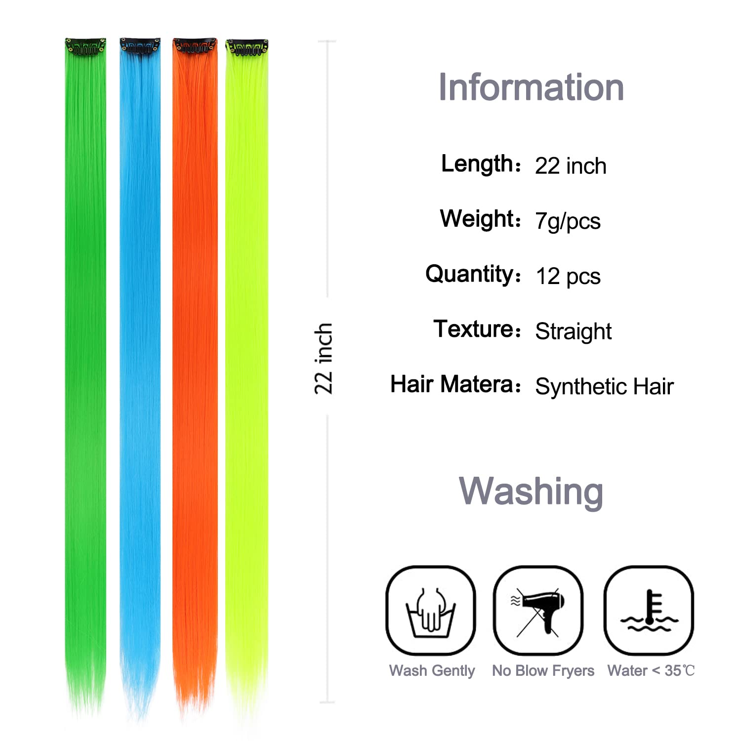 - 12 brilliant colors, each color 1 pcs, total 12 different colors in set clip-in/clip-on Colored hair extension, 1 piece with 1 clip attached and very easy to apply