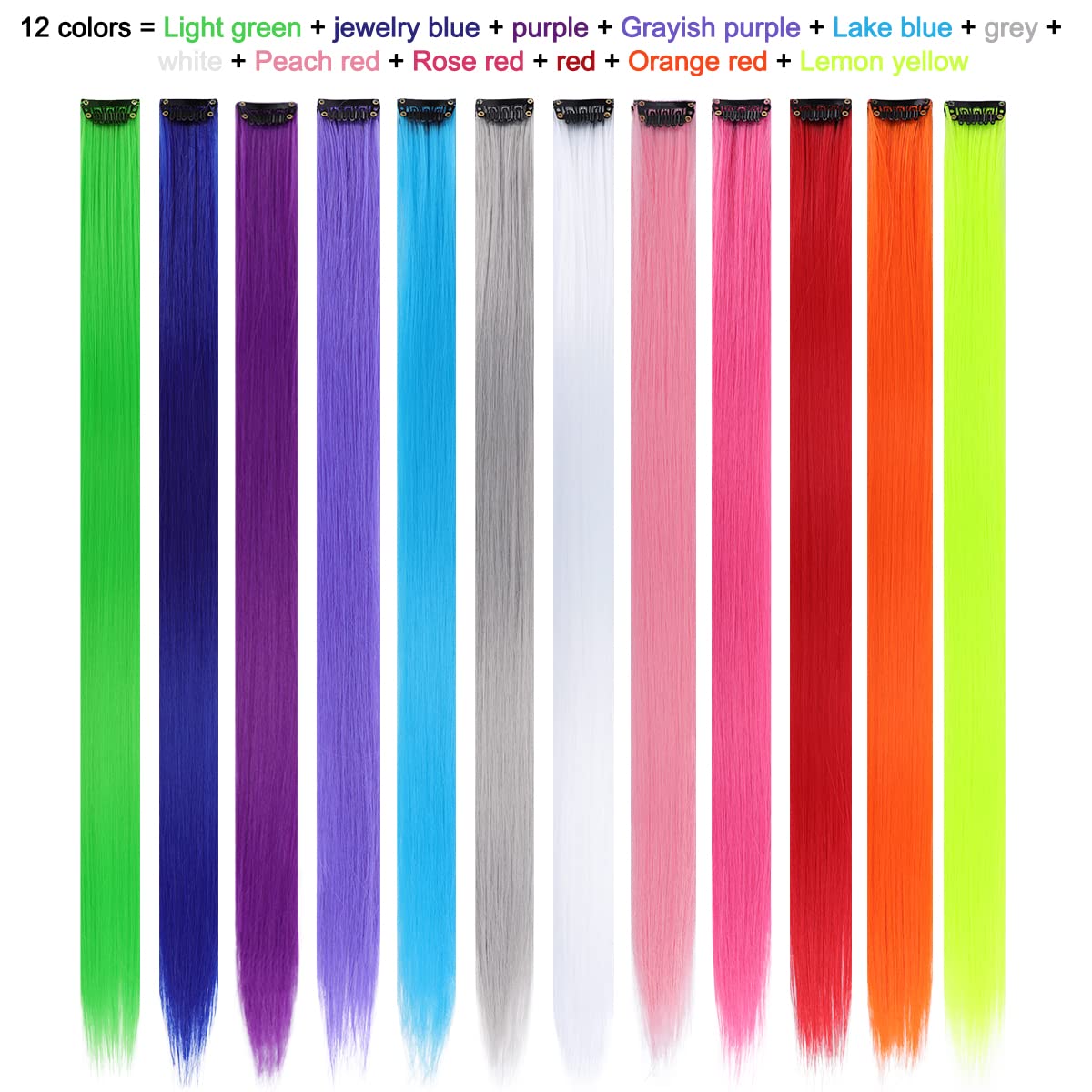 12 Pack Colored Hair Extensions Rainbow Hairpieces Party Highlights 22 Inches Colorful Clip in Hair Extensions Straight Synthetic Hairpieces for Women Kids Girls, (12 Colored)