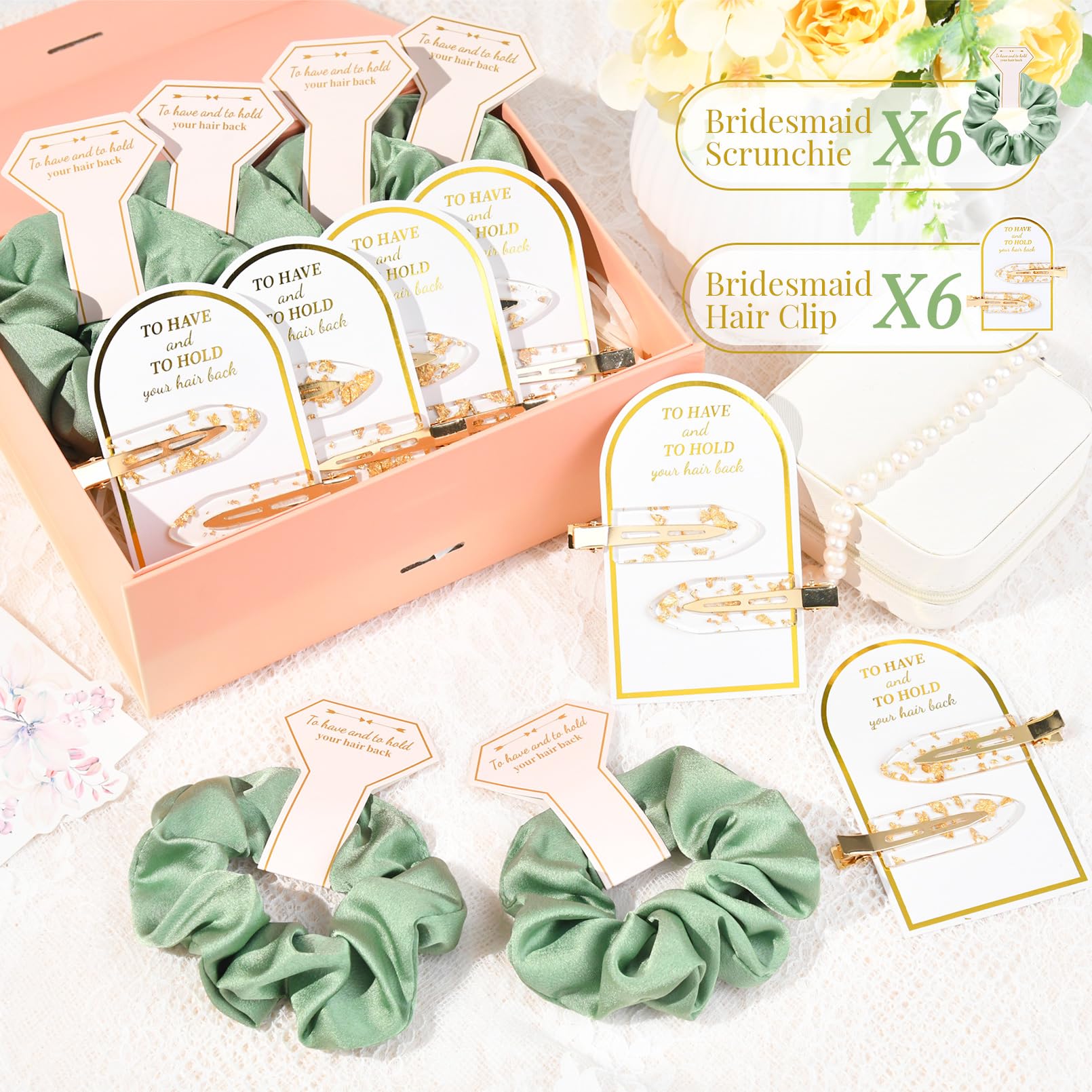 - 💖What You Will Get: this package comes with 6 set (Each set includes 2 crease free hair clips comes with the card ) gold glitter bridesmaid hair clips and 6pcs silk satin soft bridesmaid hair scrunchies It would be perfect addition to your bridesmaid's proposal boxes!