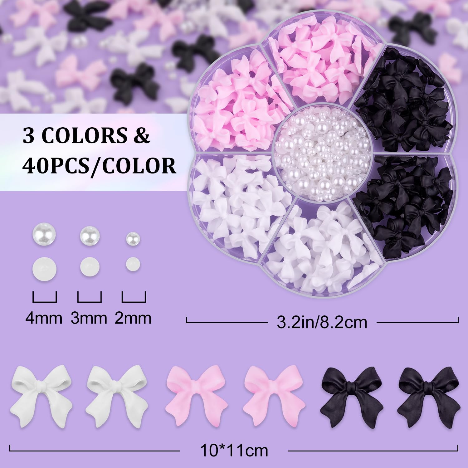 120pcs 3D Nail Bow Charms & Pearls Set - Pink, White, Black Bow Charms & White Flatback Pearls with Glue Gel (UV Needed) & Pickup Tools