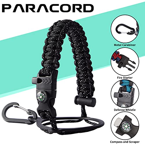 - UNIQUE DESIGNS PARACORD HANDLE: Full-function paracord handle made in individual styles to match the color of the flask water bottles. With compass, safety ring, carabiner, flint fire starter & whistle. It unravels into a sturdy and taut rope in an emergency, making the large water jug an ideal survival kit for expeditions in the wild