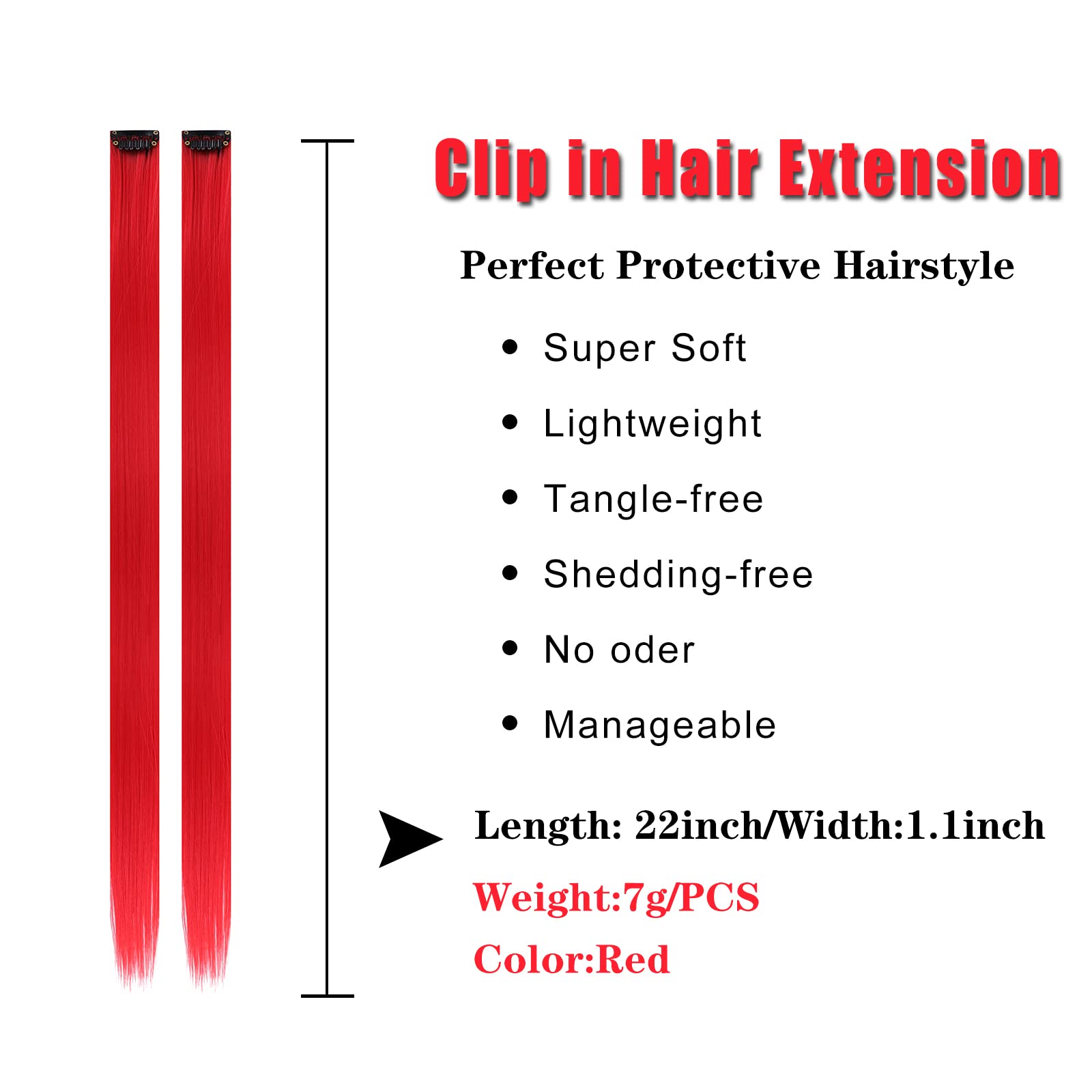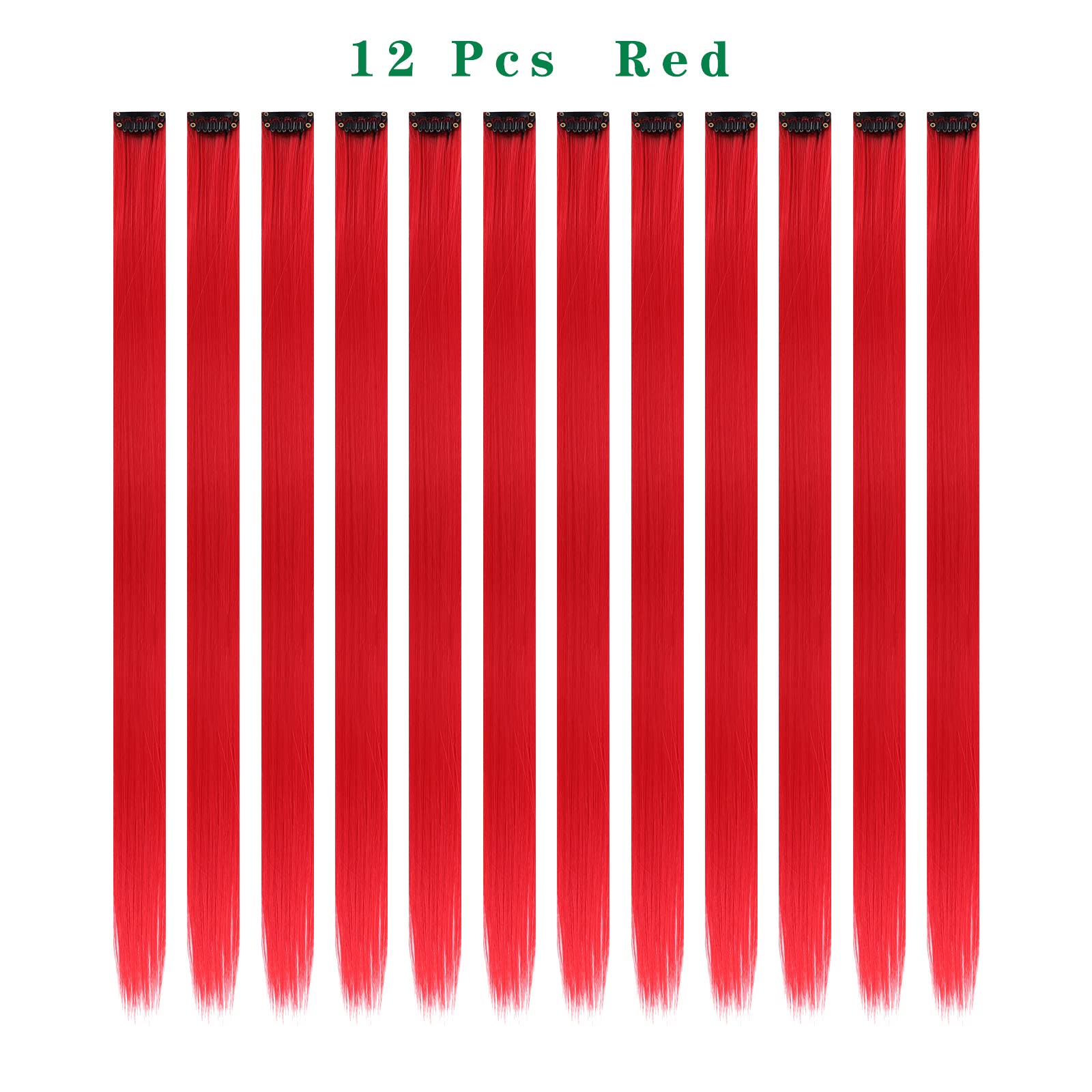 12PCS Colored Red Hair Extensions Straight Multicolor Clip in Hair Extensions Colorful 20 Inch Rainbow Hair Extensions for Kids Women's Gifts Halloween Christmas Party Highlights (12pcs Red)