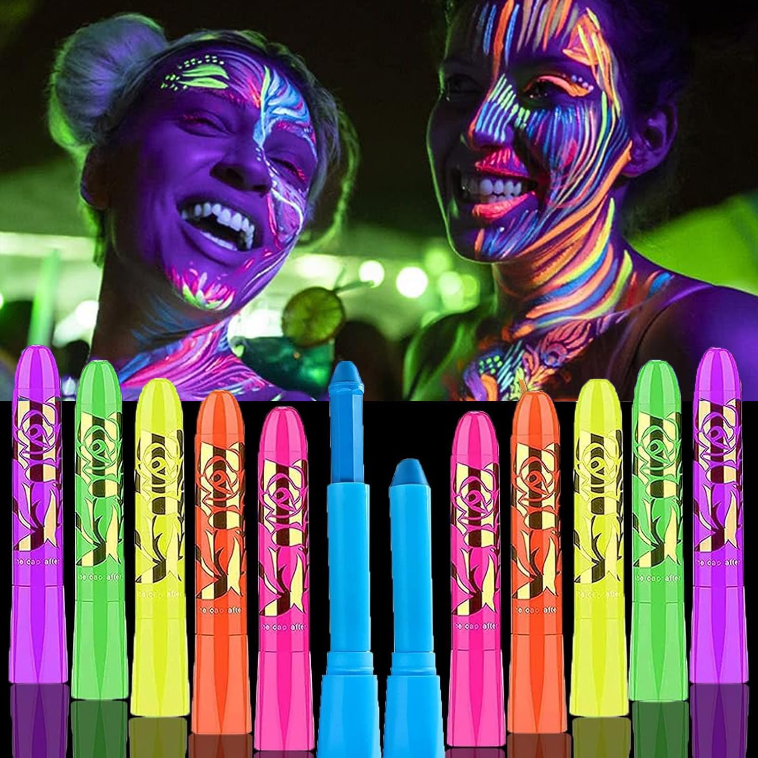12pcs Glow Face Body Paint, Glow In The Dark Under UV Black Light Sticks Makeup Neon Face Painting Kits for Kids Adult Halloween Festival Accessory Glow Party Supplies