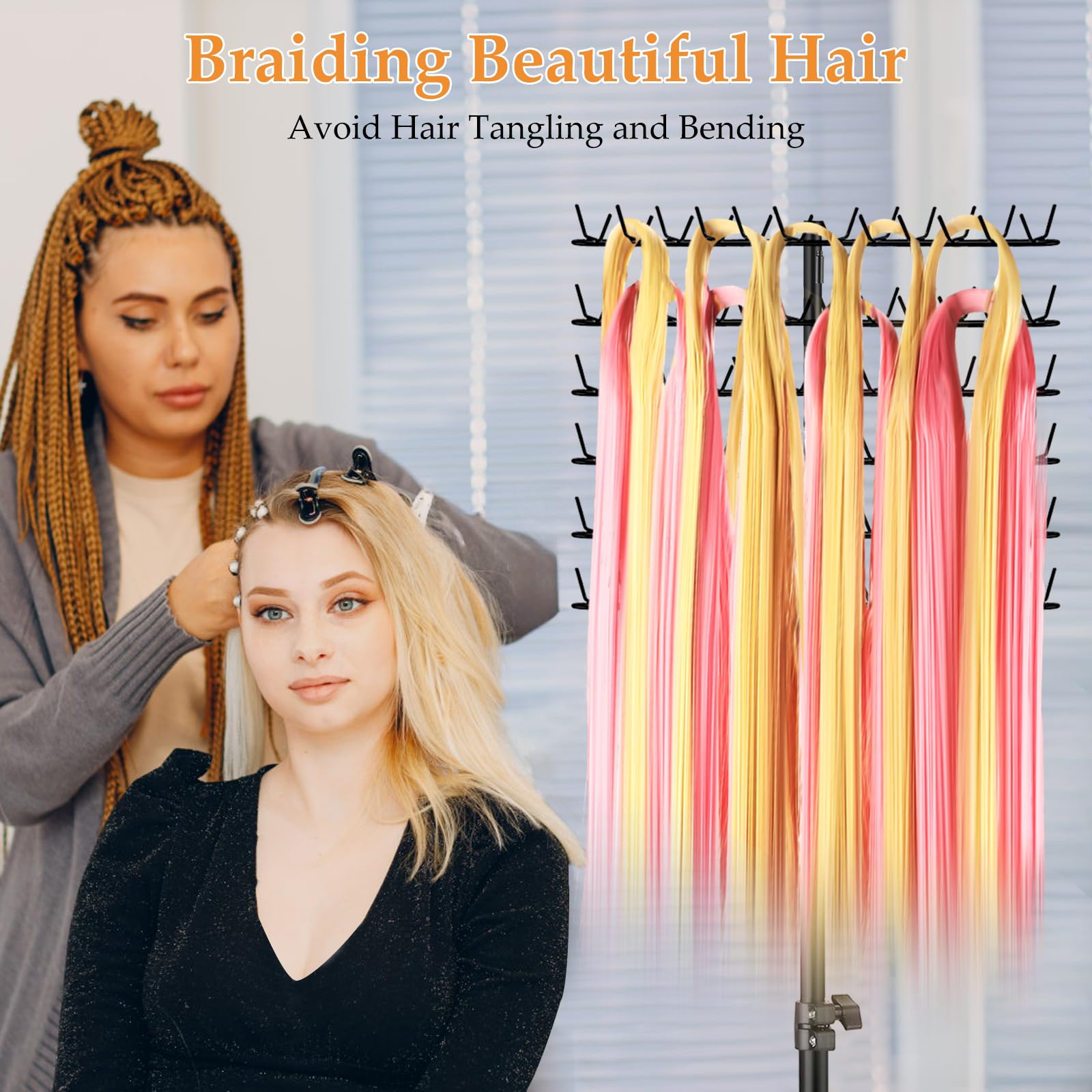 - 【Save Time And Space】Separate your braids in advance with the hair extension holder hanger to prevent tangles and ensure your hair stays organized and easy to manage. The vertical hair display stand is designed to utilize vertical space, allowing you to store hair braiding accessories, braiding tools, braiding kits, Foldable base and lightweight stand make storage and handling a breeze