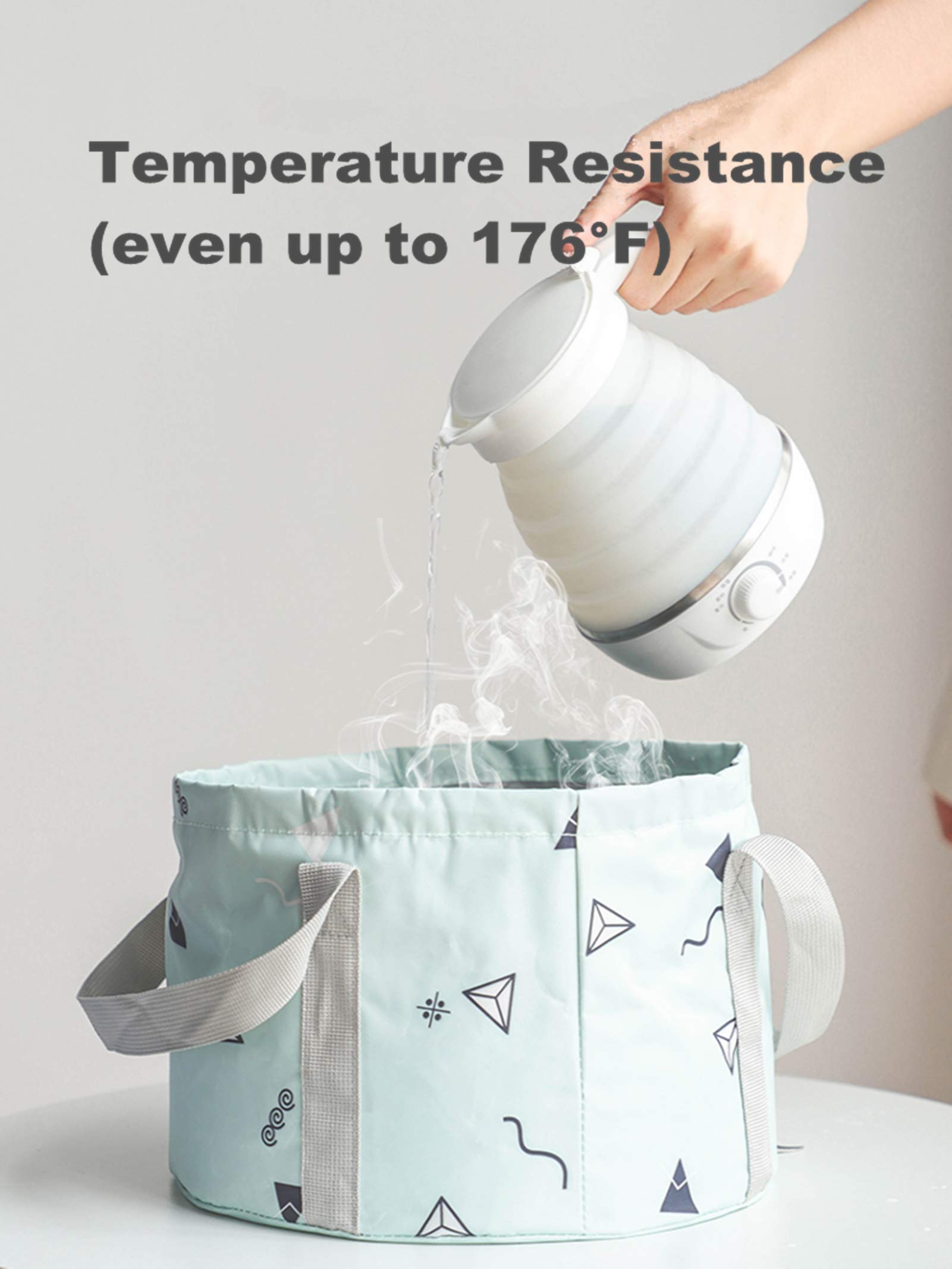 - DOUBLE LAYER WATERPROOF MATERIAL: Outer layer is waterproof and wear-resistant design. The inner layer is made of high-tech PEVA waterproof material, high temperature resistance(even up to 176°F). Good idea to use it like travel foot bath, fishing bucket, camping or picnic, hiking water container, etc.