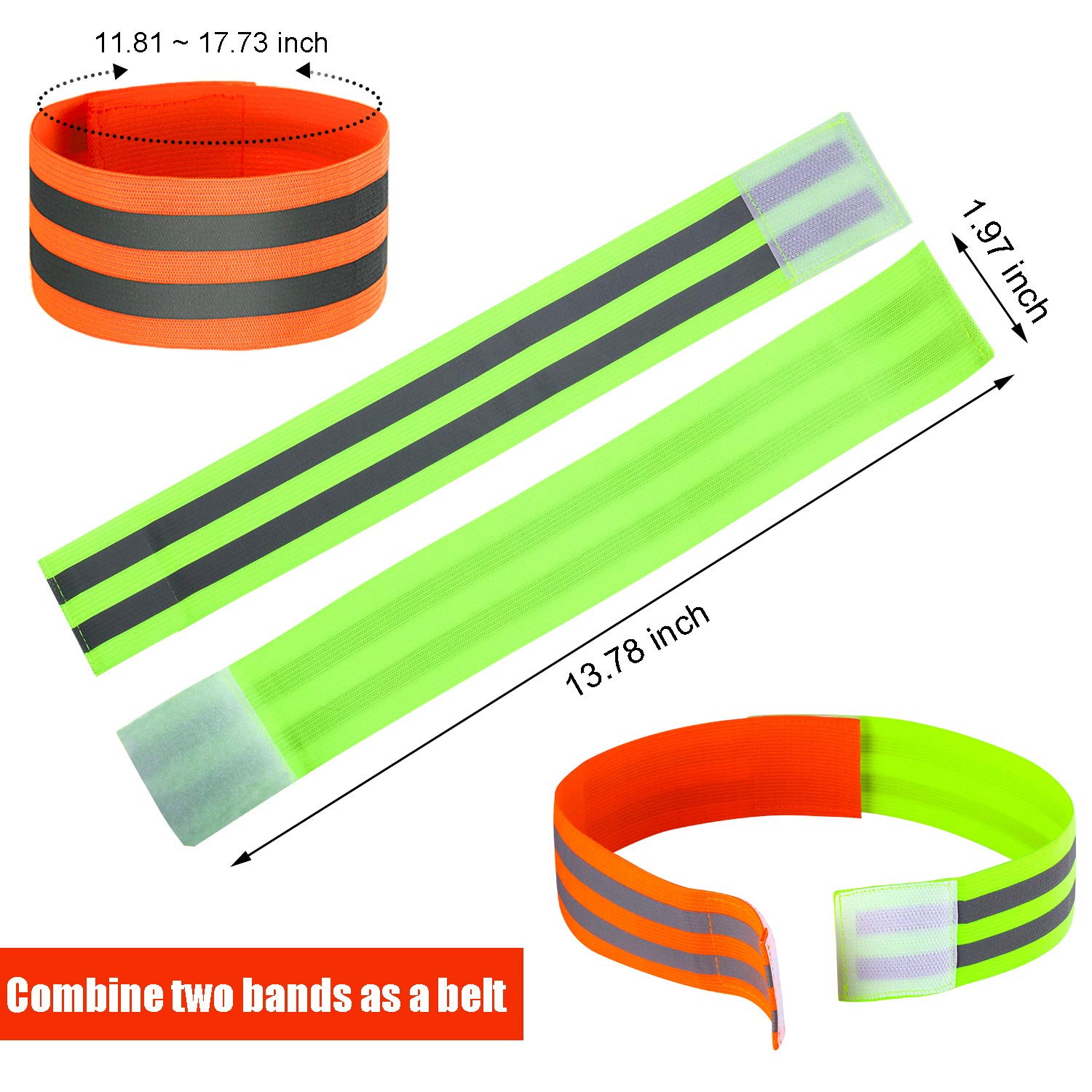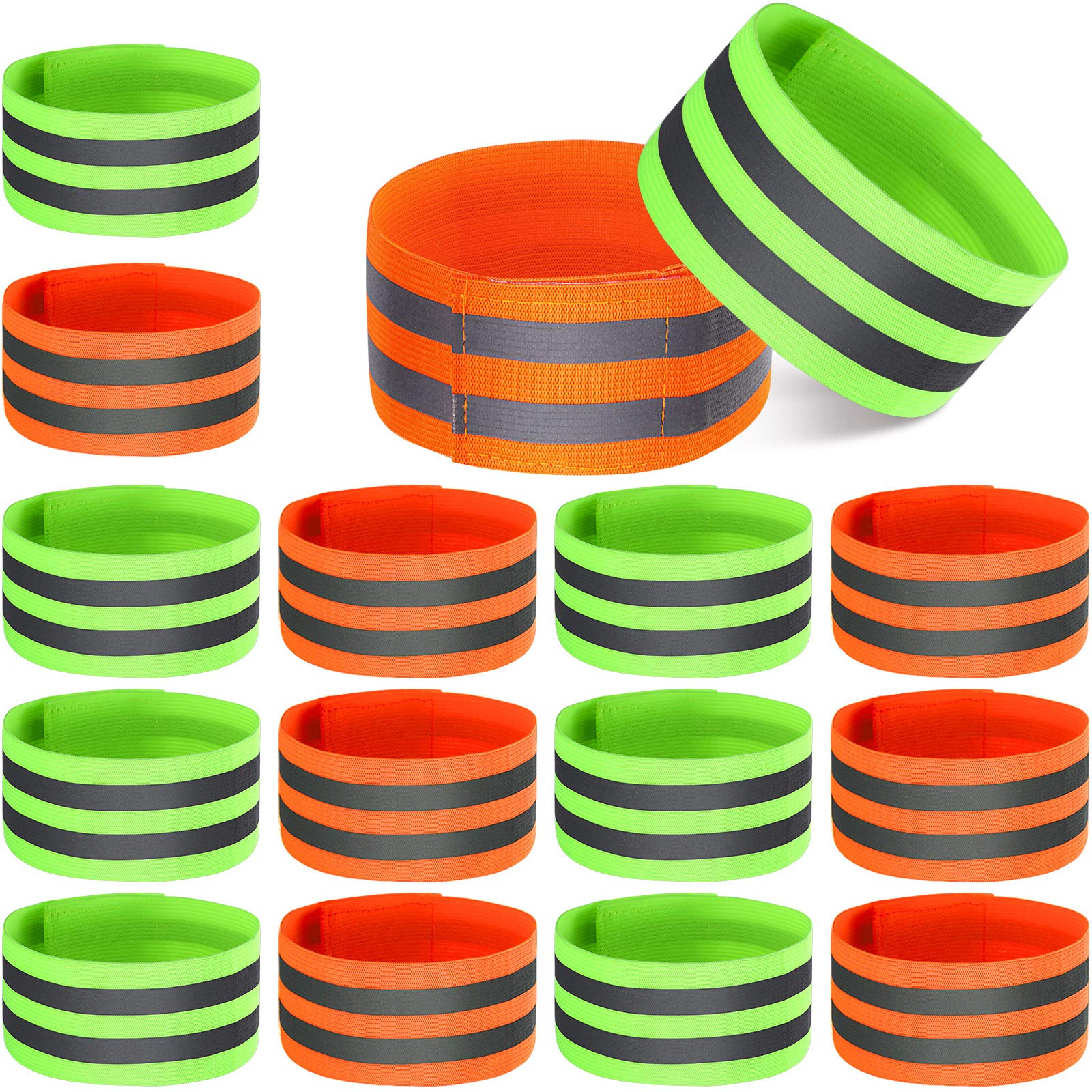 - What you'll get: total 16 reflective bands, 8 pieces green, 8 pieces orange, lightweight, versatile, comfortable and fully adjustable, so it can be worked as reflective arm bands, reflective wrist bands, reflective ankle straps, reflective belt, reflective ankle bands, reflective bike leg band, bicycle pants clips, straps, cuffs or holders