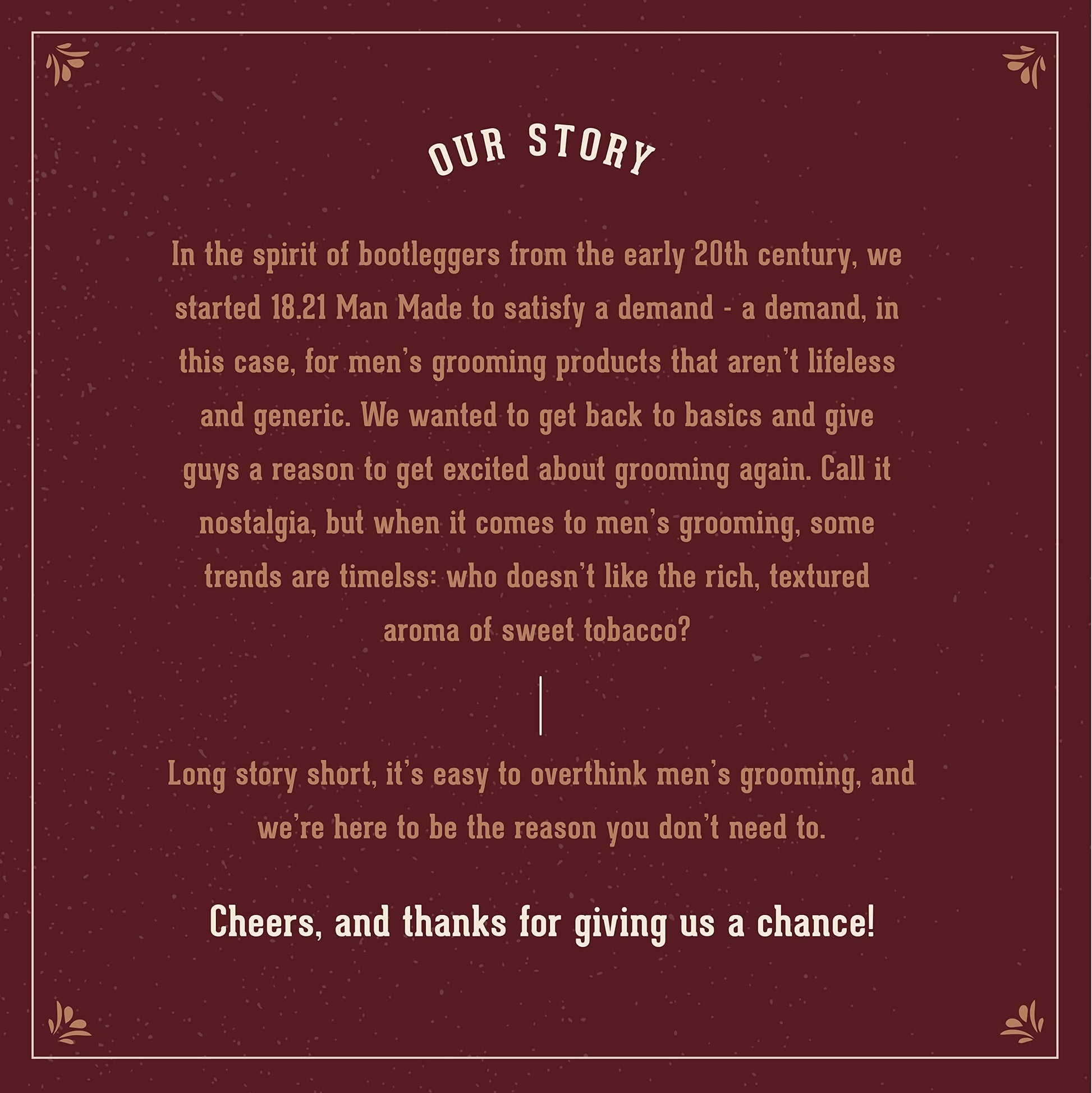 AROMA PASTE features 18.21 Man Made's signature Sweet Tobacco oil blend. A masculine aroma inspired by sweet Virginia pipe tobacco and the roaring spirit of swanky Prohibition era speak easy lounges. The first impression will introduce notes of spicy saffron and dried fruit which, will mellow during the dry down to reveal notes of manuka honey, dark toned vanilla and tonka bean to sweeten the touch of tobacco, exotic woods and powdery musk that round out the base. Leaves a lasting impression.