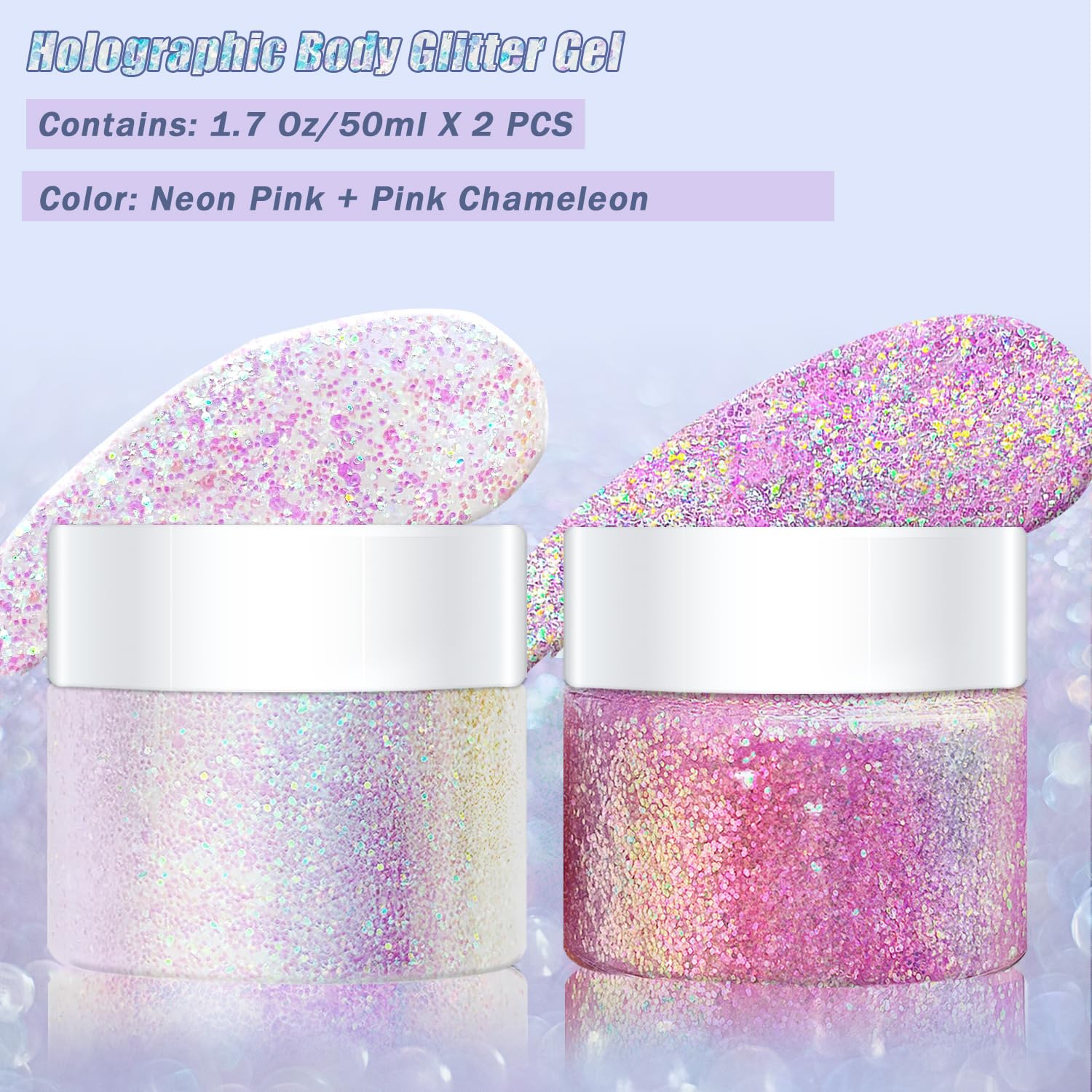 2 Pack Holographic Body Glitter Gel for Body, Face, Hair and Lip Color Changing Sparkling Face Glitter Gel for Music Festival Halloween Concerts Art Party Rave (Neon Pink + Pink Chameleon)