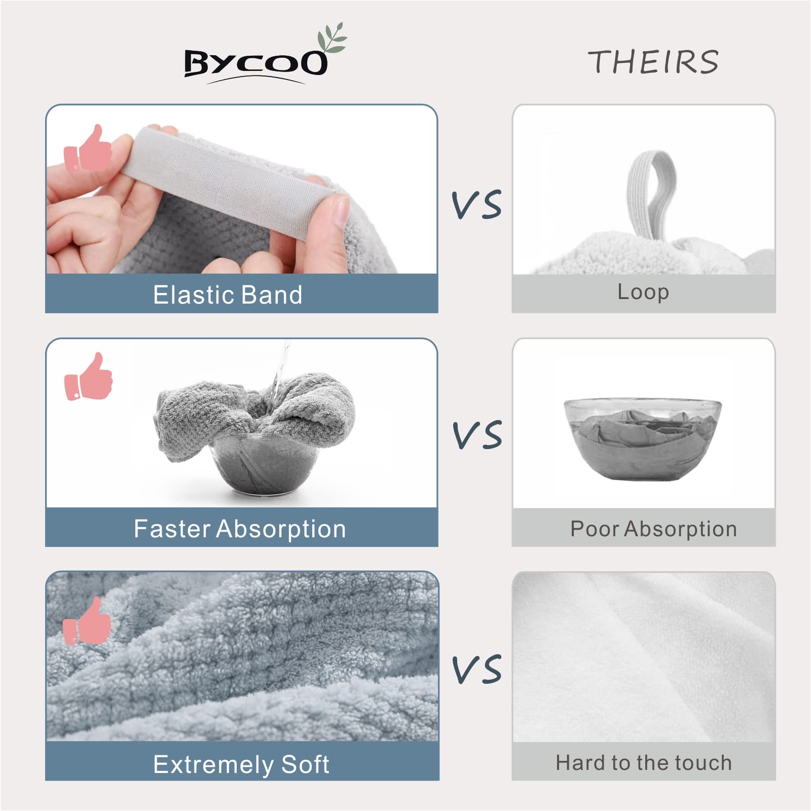 - PROTECT HAIR AT ITS WEAKEST, CUTS DOWN DRYING TIME - Tired of using a traditional towel that takes forever to dry your hair? BYCOO microfiber rapid dry hair towels wick water away from hair, without rubbing or heat for healthier hair—reduce dry time by 50%.