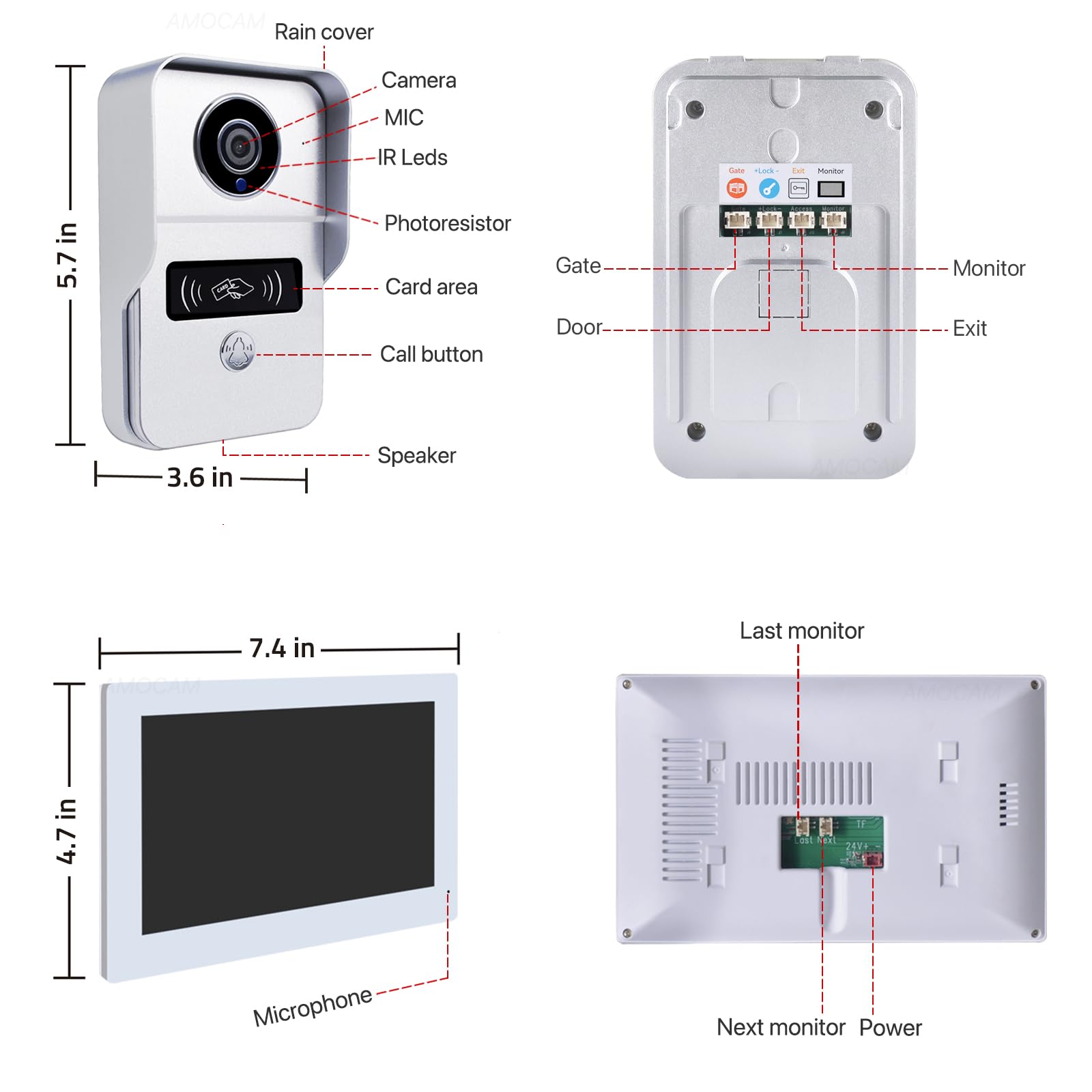 - 🔔【7 Inch Touch Screen and 1080P Doorbell Camera】7 Inch IPS monitor with 32G micro SD card, touch key operation, hand-free, support Wifi connect to TUYA APP. 1080P doorbell camera with weaterproof cover and IC card area, built-in infrared sensor, 130º wide angle, night vision, rainproof, dustproof and vandal proof. 2-wire power supply, It can connect all 12V electronic locks.