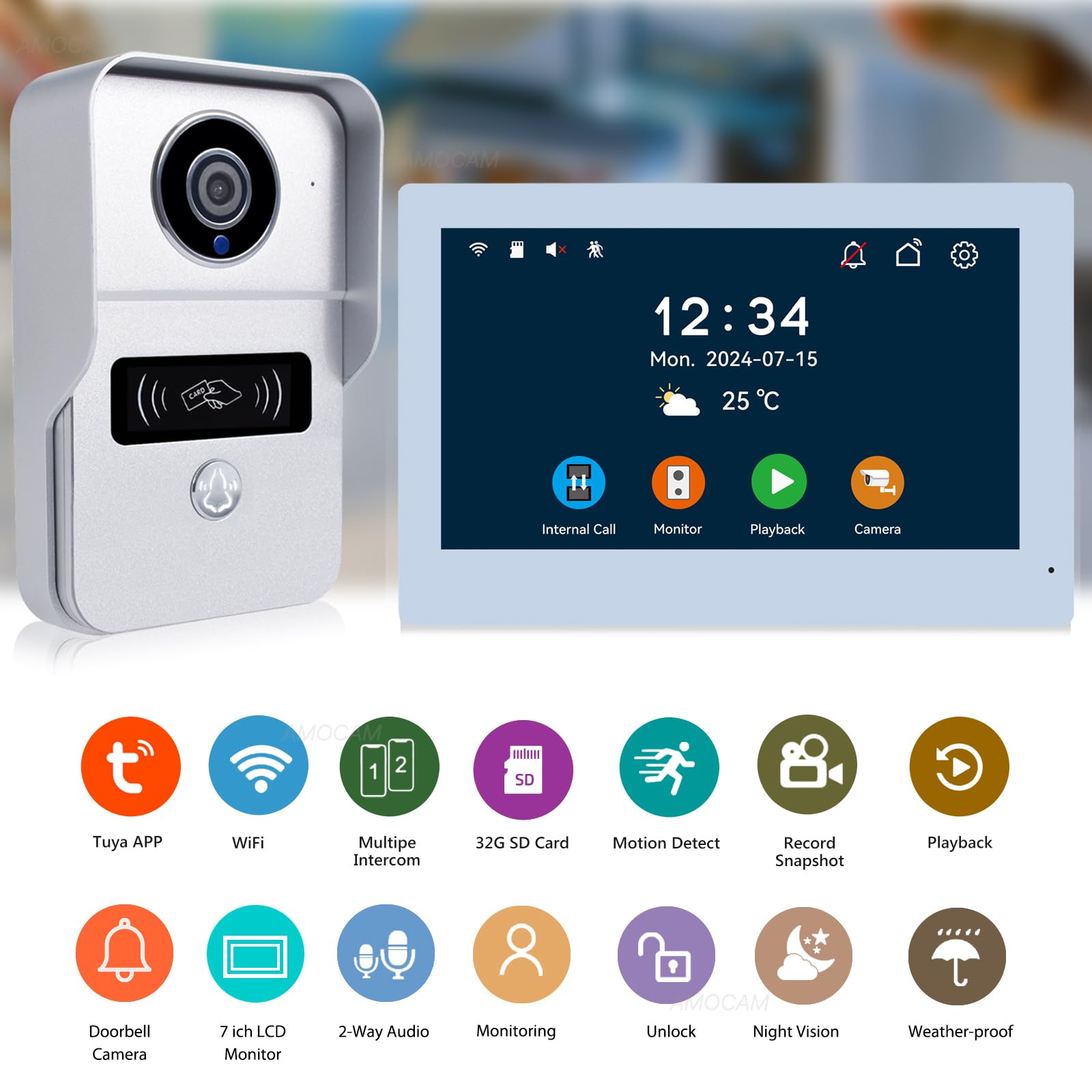 2-Wire Video Intercom System, 7 Inch 1080P Touchscreen WiFi Video Doorbell Door Phone System, No Monthly Fees, Snapshot, Monitoring Tuya App Card Unlock for Home Apartment (Monitor with WiFi)