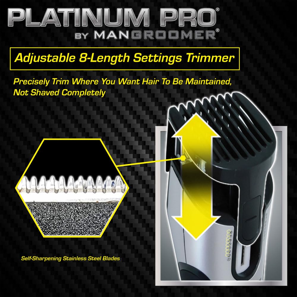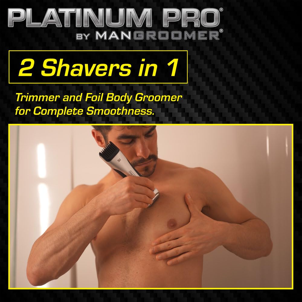 - The New PLATINUM PRO by MANGROOMER Body Groomer, Ball Groomer and Body Trimmer is our most Advanced Body Groomer and Body Trimmer ever built with over 18 years of research and development. Plus, we included a Bonus Storage Case and an extra Foil Blade for you!