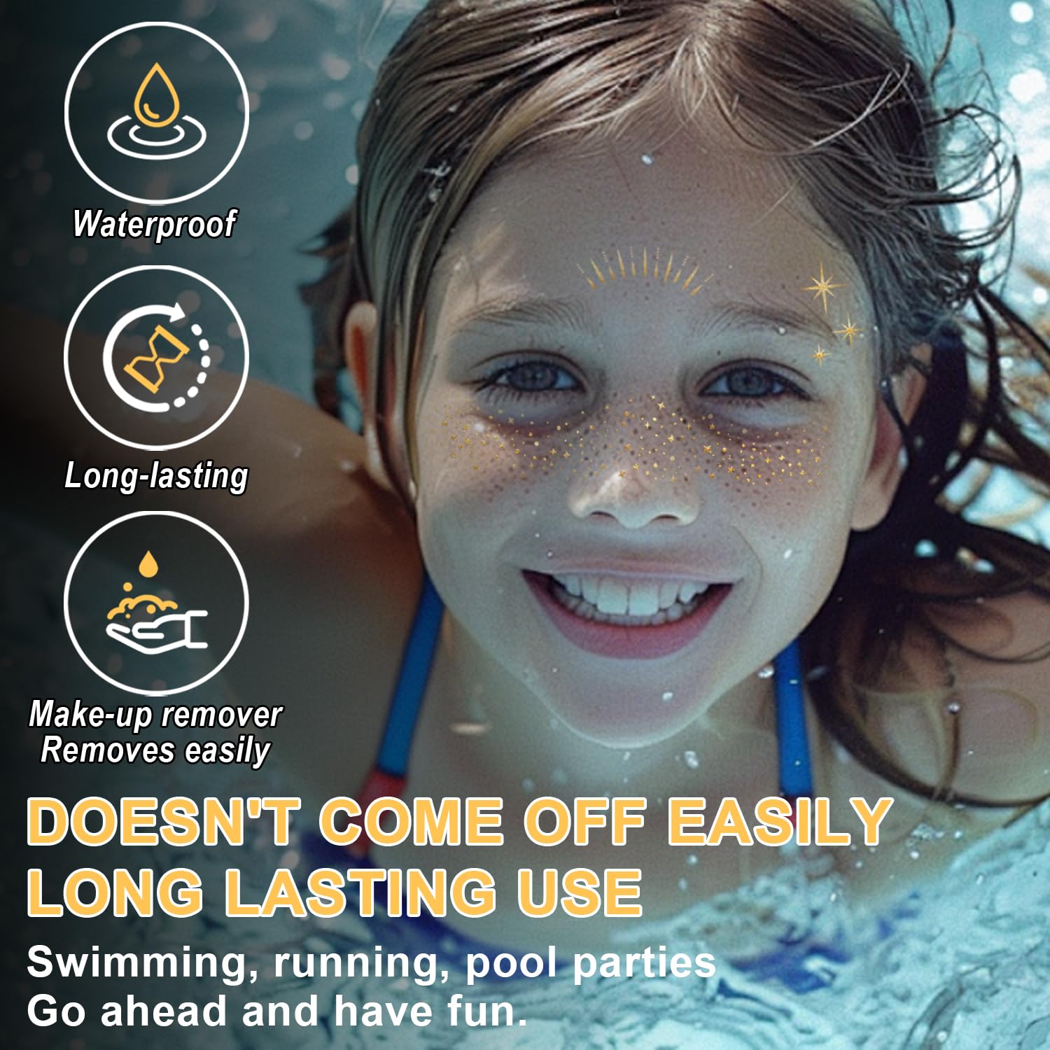 - LONG-LASTING & WATERPROOF - Keep your radiant look from day to night with LemonSac's waterproof glitter freckles face tattoo. Designed to stay vibrant and intact, these freckle tattoos will withstand a full day of activities—whether you're braving the rain, hitting the pool, or dancing at a music festival. No need to worry about reapplying; our freckle makeup is made to last through all your adventures