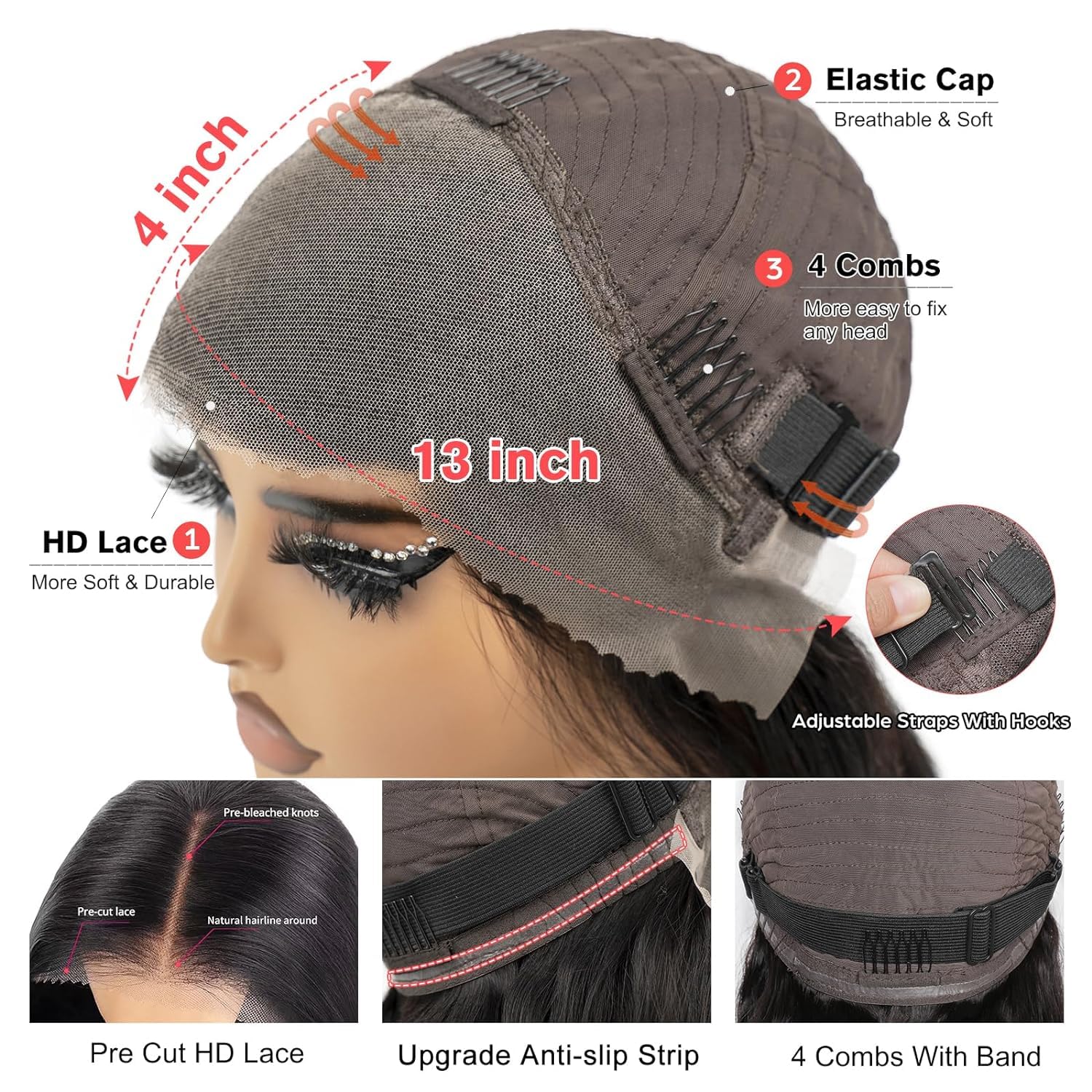 - 【Wig Cap】Default Average Cap Size 22.5' Circumferences, Has Two Adjustable Straps With 4 Combs Inside, Fit For Most Of Head.
