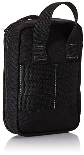 Details: Black. Compact 5' x 7' x 2' size. Drops into or attaches onto backpack or bag. Full clamshell opening main compartment with dual zippers. Inside left: slip pocket; key ring; tie-down loop, elastic organizer with 9 divisions. Inside right: zipper pocket; elastic organizer with 6 divisions. Inside center has additional elastic loop. Front exterior: 2' x 3' loop field for patches; mesh slip pocket with hook-and-loop closure. Back exterior: oversized carry handle; attachment webbing. Molle compatible. Can be attached using two 3' TacTie attachment straps (sold separately). lon thread (stronger than ordinary industry standard nylon thread). #AS-100 high grade closed-cell foam padding material for superior shock protection. High tensile strength nylon webbing. #10 high strength zippers and zipper tracks. Utx-duraflex nylon buckles for low sound closures.