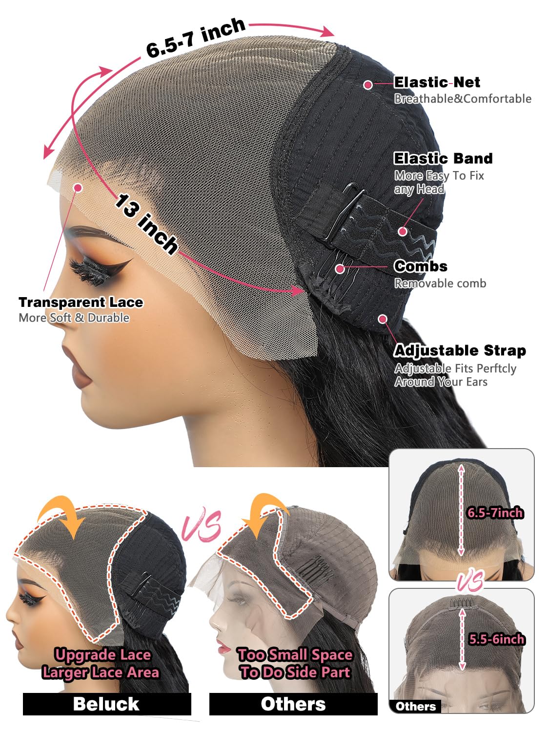 - 【Glueless Wig Large Advantage】 ---3d Dome Cap Design, 6.5-7 Inch Lace Parting, Hd Lace, Average Size 22.5inch Cap With Anti Slip Elastic Band, Which Can Fit Most People’ Head. Wear And Go Glueless Wigs Human Hair, Suitable For Birthday Party,Vacation,Worktime,Graduation, All Scenes With Beluck Wig Can Makes You More Attractive.