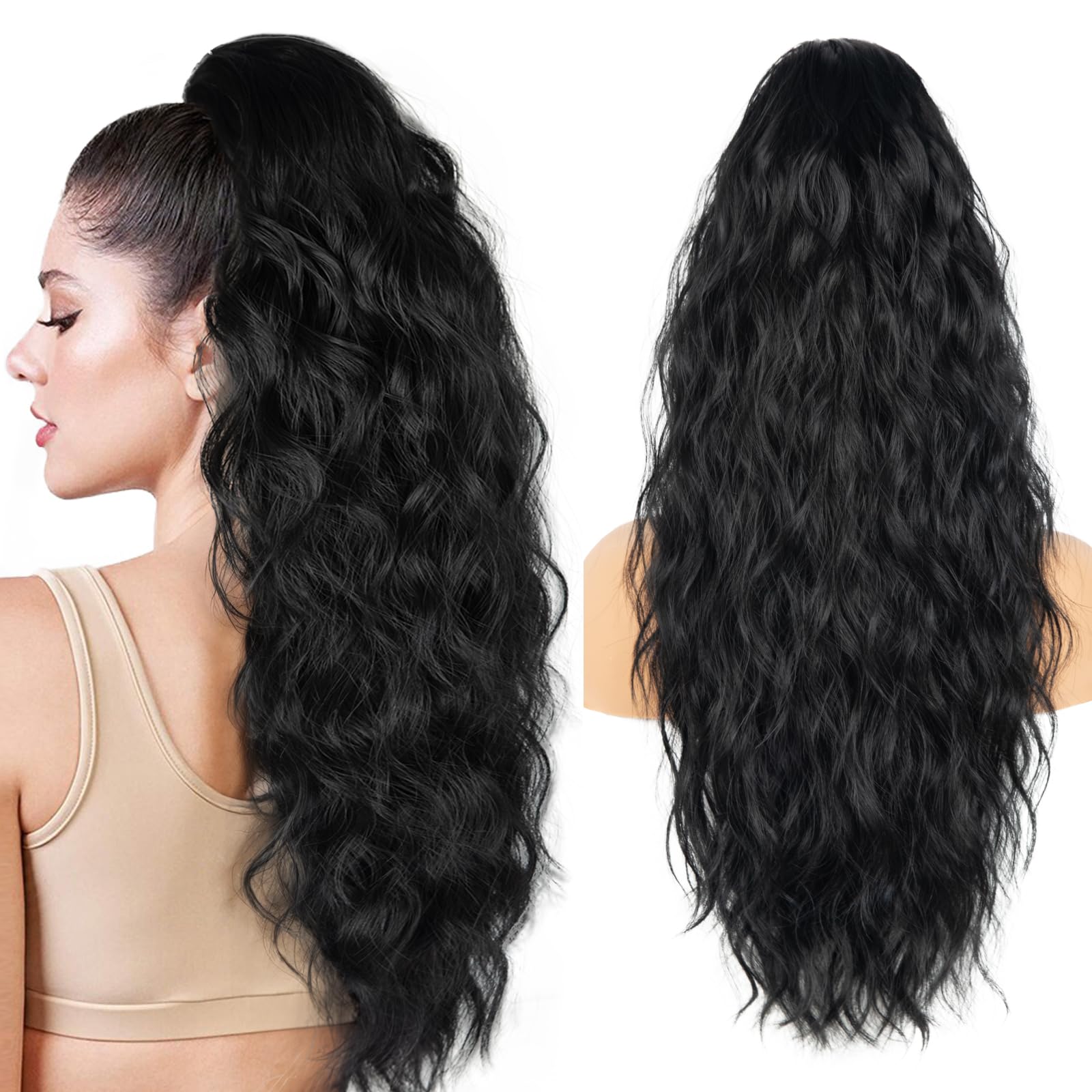 26 inch Black Ponytail Extension, Drawstring Ponytail for Women, Long Wavy Pony Tails Hair Extensions, Synthetic Hair Extensions Ponytail for Daily Use (Color: Black)