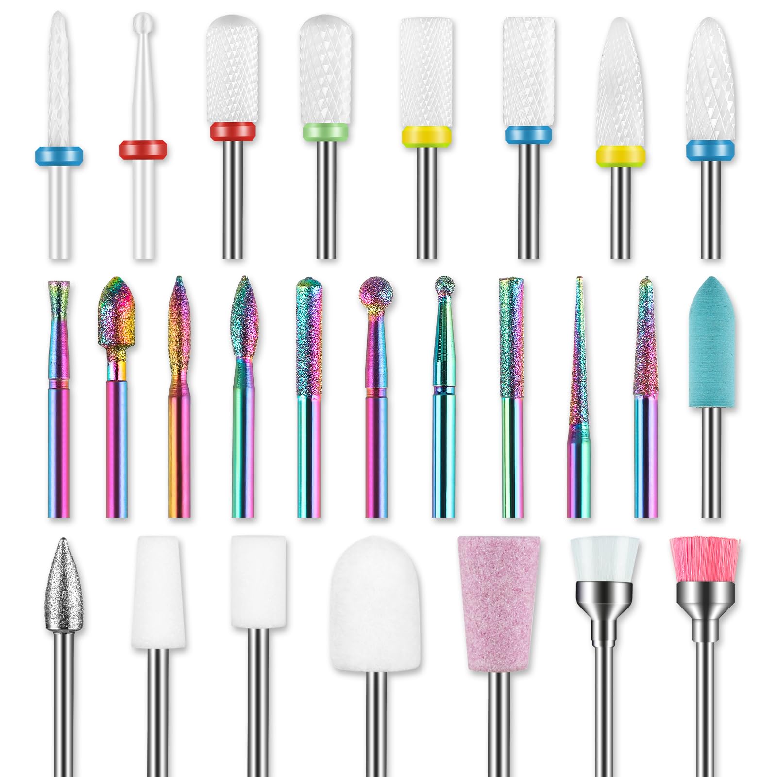 - 【New Design in One Set】In addition to basic 8pcs ceramic nail drill bits, 11pcs diamond cuticle drill bits, 1pc silicone bit, and 2pc brush bit, the nail drill bit set also includes 3pcs newly designed Corundum drill bits and 1pc felted wool bit. All in one set for both manicure and pedicure, which also suits both beginners and professionals