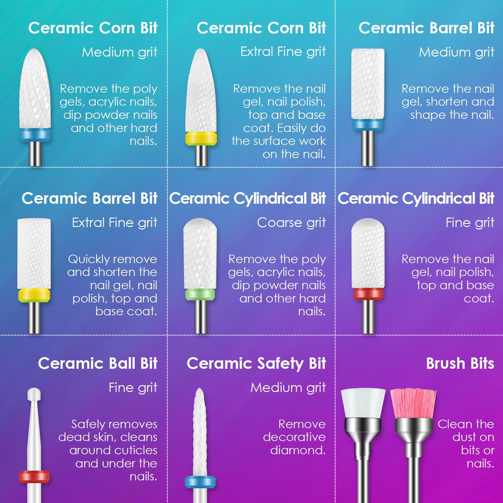 - Long Time Use by Premium Material: Made of superior ceramic material and the highest precision standards diamond & corundum, these nail drill bits have the optimum strength, sharpness, durability, heat, and corrosion resistance for long service time. They are safe to use, do not worry about hurting your skin, suitable for natural or artificial nails. (Note: Do not drop the bits)