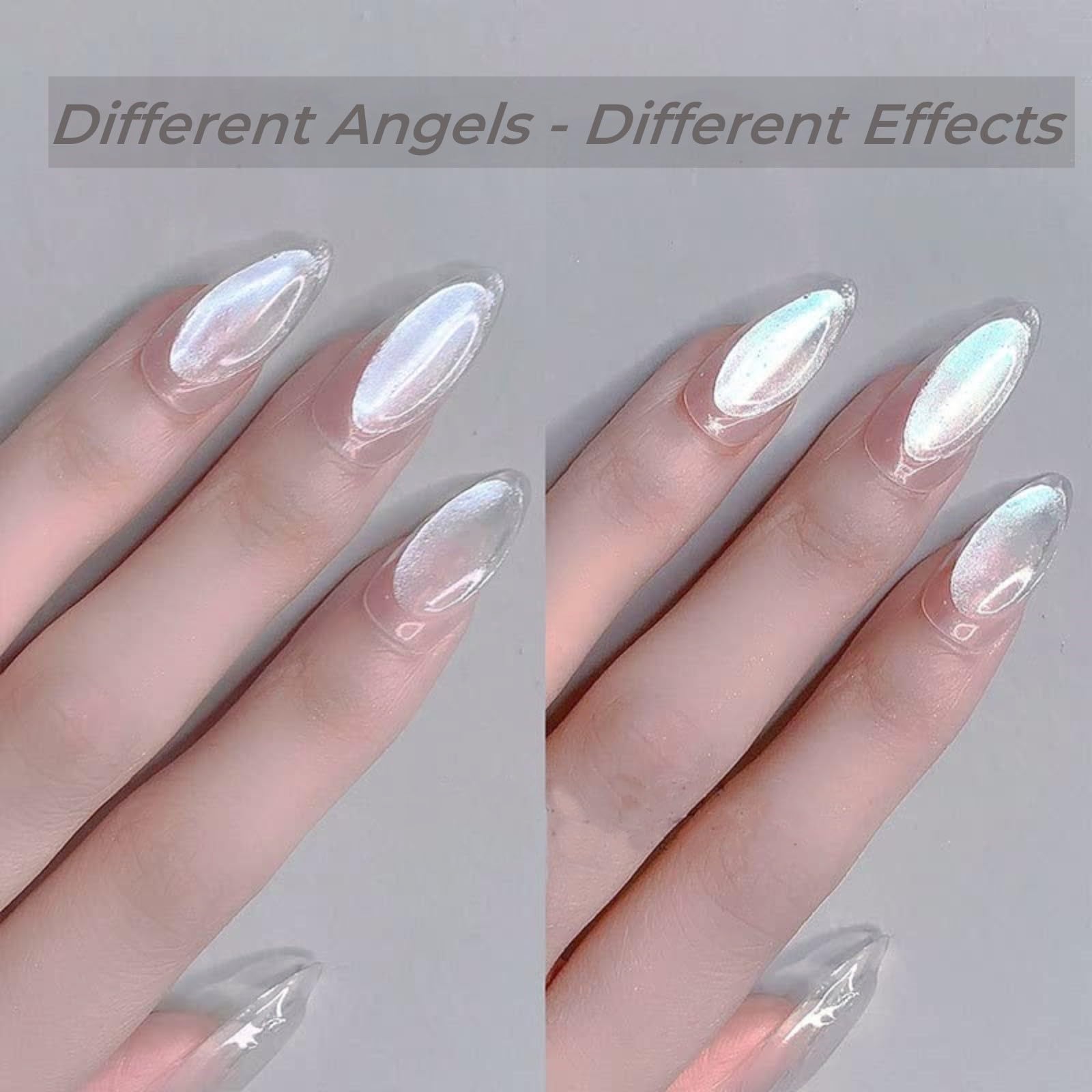 - Low Light Effect: The use of nail chrome powder with different colors of nail polish topcoat will present different rainbow pearl gradient effects, and the dazzling effect will be more obvious in sunlight.