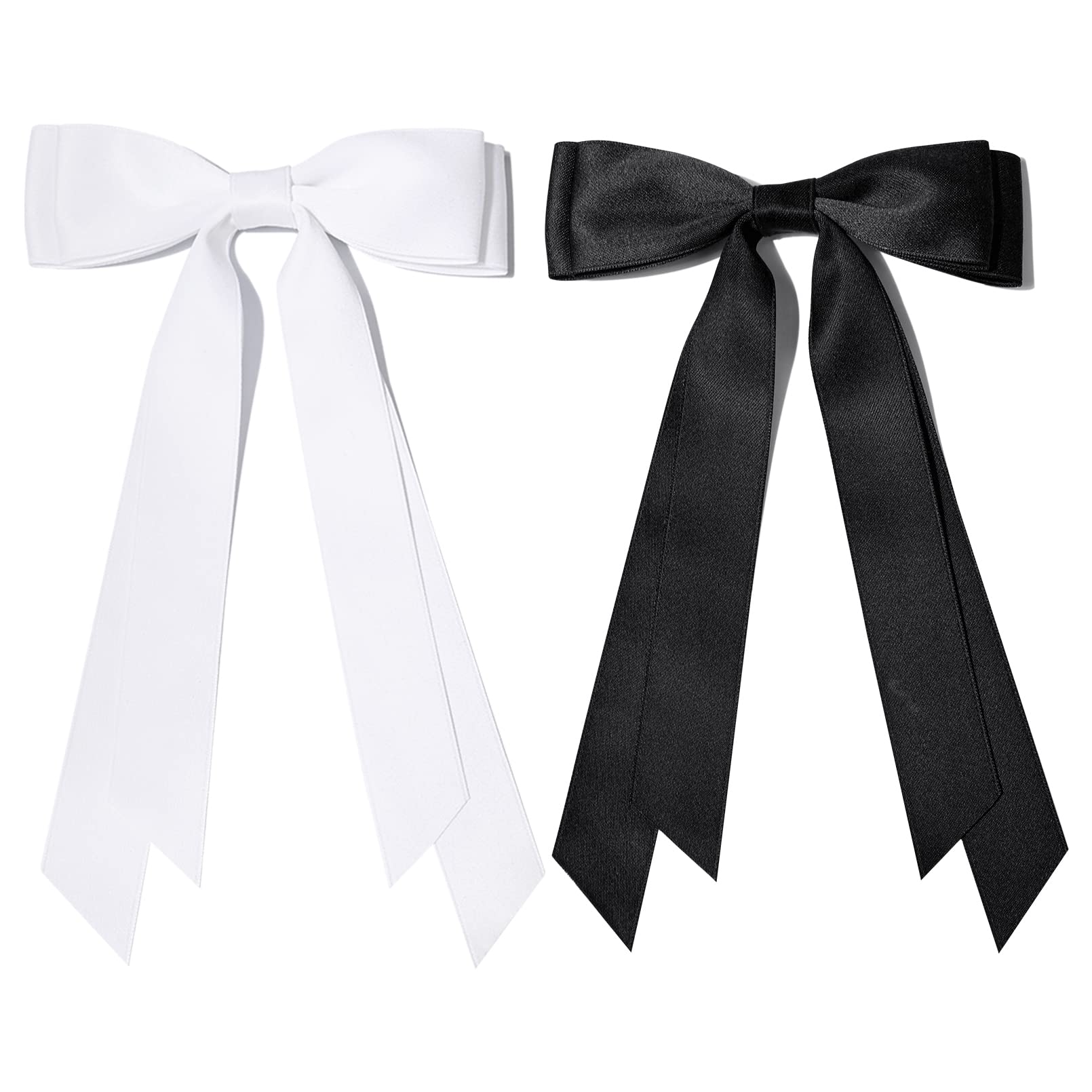 2PCS Silky Satin Hair Bows Hair Clip Black White Hair Ribbon Ponytail Holder Accessories Slides Metal Clips Hair Bow for Women Girls Toddlers Teens Kids