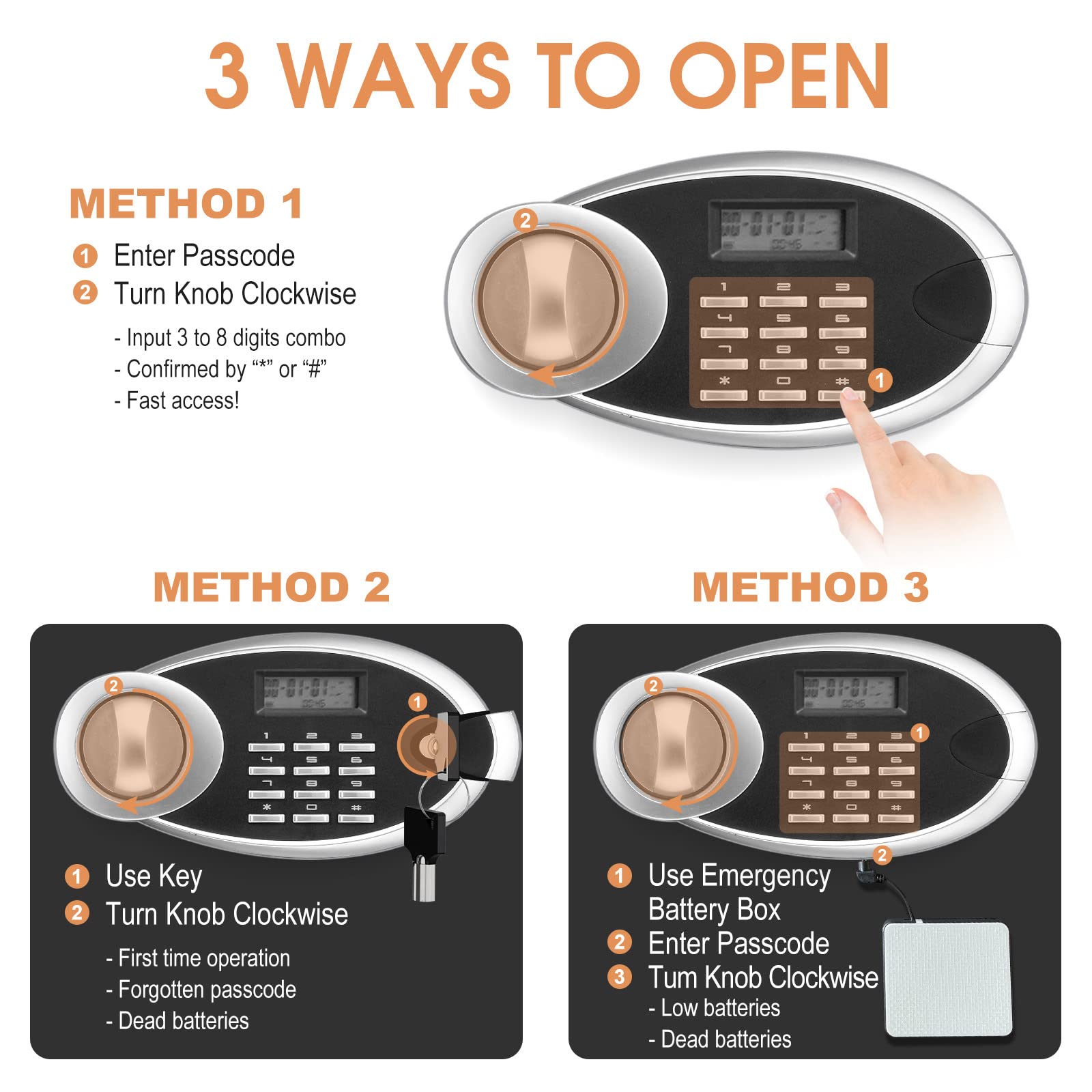 - 🔥🔥🔥【3 WAYS TO OPEN IT】①Personal code/master code+turning knob. ②Emergency keys+turning knob.The first time you get the safe, please use the key to open the door. ③External battery box+personal code/master code+turning knob. Attention: Don't keep the emergency keys in the safe. If you forget the password, you will not be able to open it