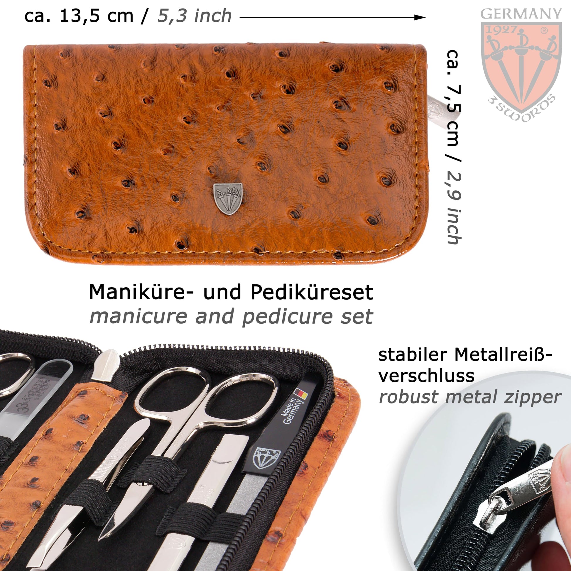 3 Swords Germany - brand quality 8 piece manicure pedicure grooming kit set synthetic leather case ostrich cognac - Made in Germany
