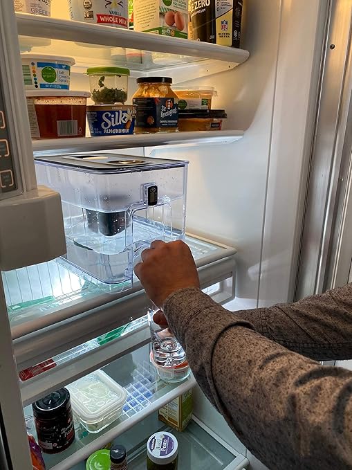 - This large water filtration Dispenser for refrigerator is easy to pour and refill; This space efficient dispenser fits perfectly on refrigerator shelves or countertop and is great for families