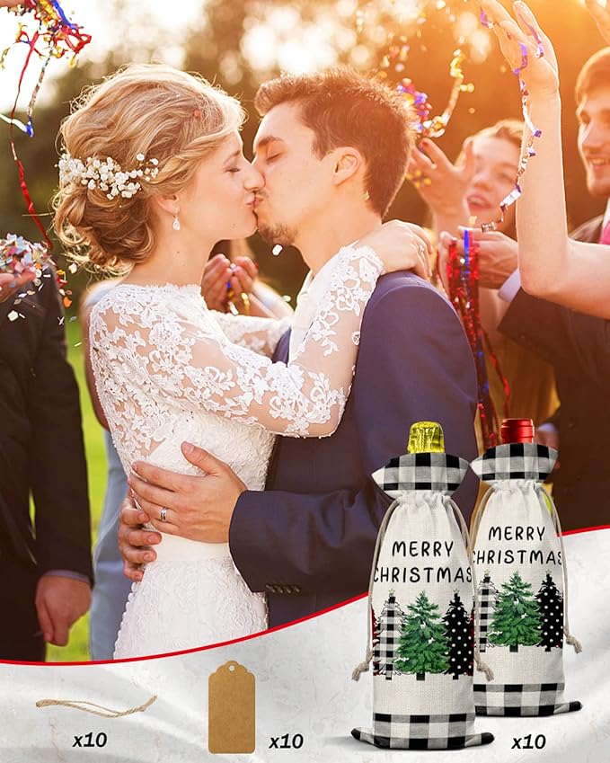 10 Pack Wine Bottle Bags, Christmas Tree Wine Bottle Cover with Drawstring, Vintage Black White Checkered Xmas Tree Gift Bag for Champagne Wedding Birthday Party