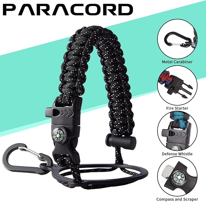 - UNIQUE DESIGNS PARACORD HANDLE: Full-function paracord handle made in individual styles to match the color of the flask water bottles. With compass, safety ring, carabiner & whistle. It unravels into a sturdy and taut rope in an emergency, making the large water jug an ideal survival kit for expeditions in the wild