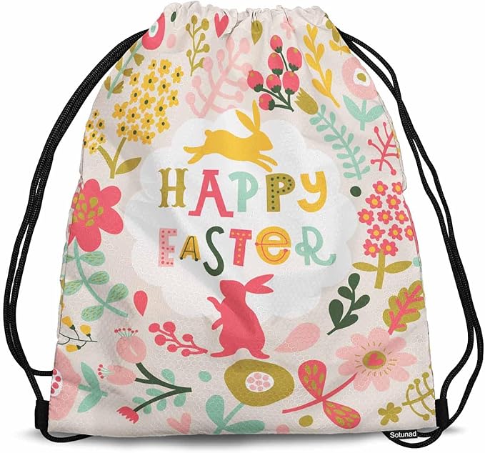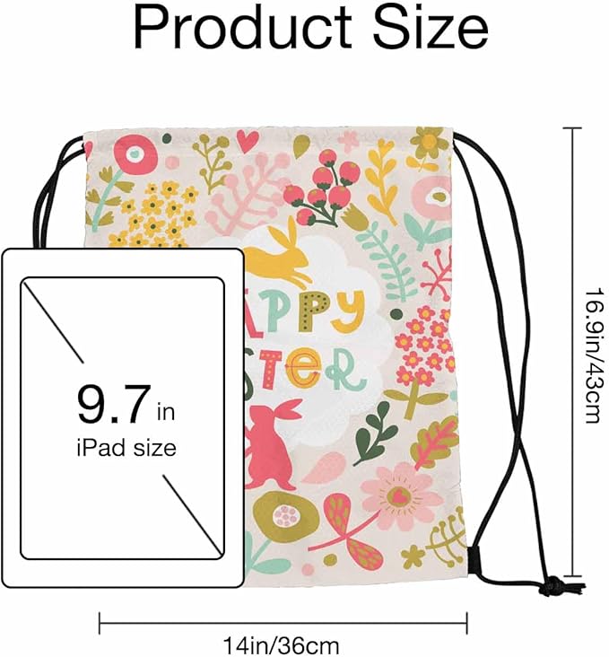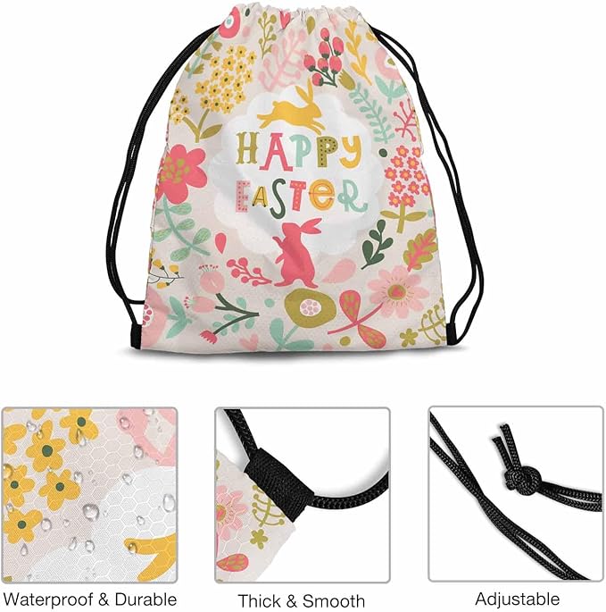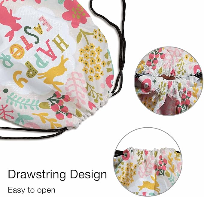 Drawstring Backpack Happy Easter Lightweight Gym Backpack Surrounding by Rabbits Pink Yellow Flower Red Berry Green Leaf for Women Men 14x16.9 Inch