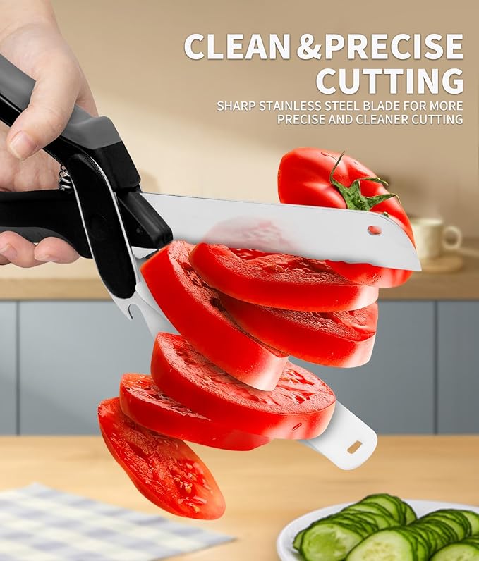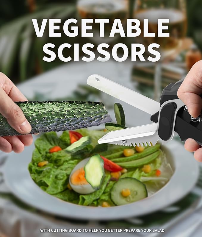 - Unique Design, More Efficient: The kitchen cutting board knissors consists a sharp knife and a PP cutting board, making them an essential vegetable slicer in the kitchen.This clever cutter helps you cut various vegetables faster, speeding up your salad preparation time