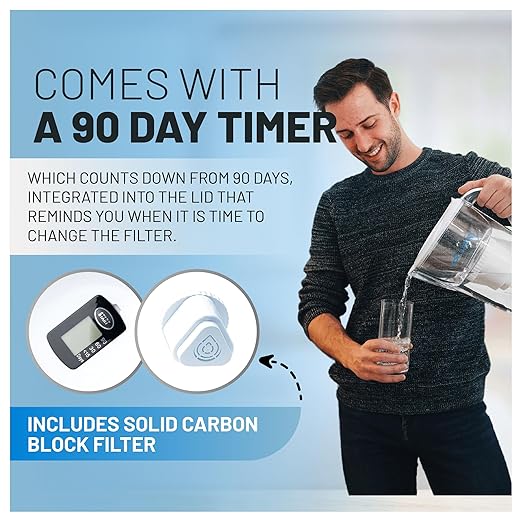 - Space-Efficient and Smart Design: Features include a 10-cup capacity that fits perfectly in your fridge, an intelligent lid for easy refilling and spill prevention, and a long-lasting filter with a 150-gallon capacity. The integrated LED timer reminds you when it's time for a filter change, ensuring optimal performance.