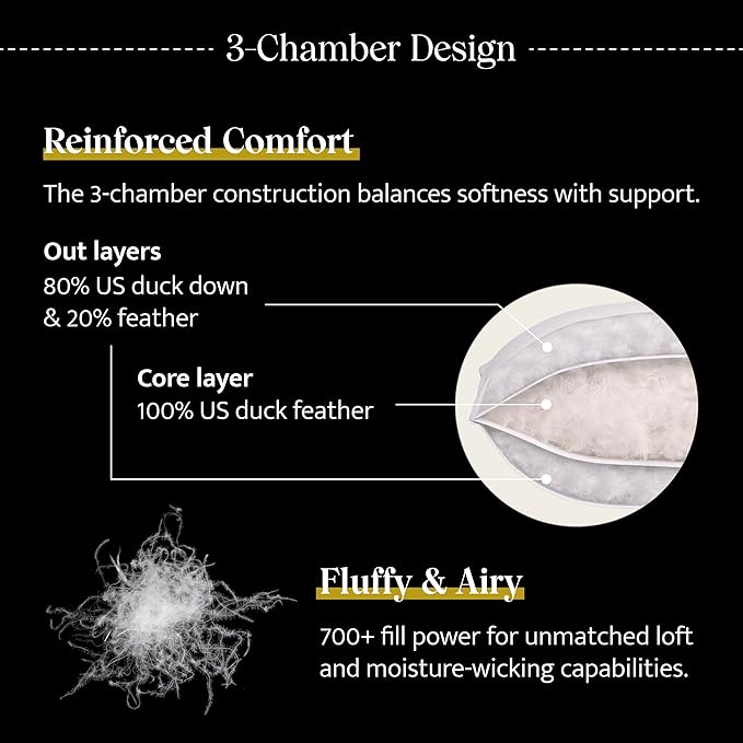 - 【Sourced in America, Made in Canada】Delight in premium comfort with our White Duck Down 3-Chamber Pillow. Generously filled with the finest RDS American white duck down and feathers, it guarantees ethical sourcing and our dedication to animal welfare. Proudly featuring the DOWNMARK label from the Down Association of Canada, our pillow is a true testament to Canadian craftsmanship, meeting the highest standards.
