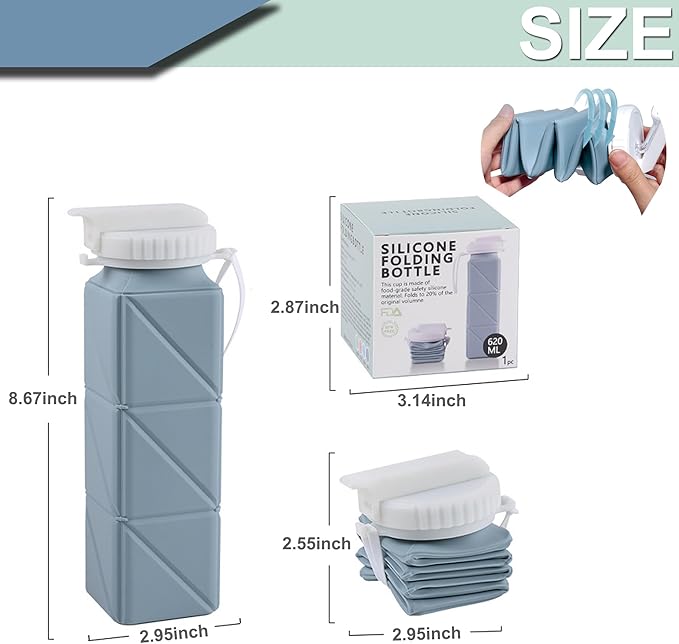 - 【TAKE IT EVERYWHERE】This silicone water bottle is designed with your convenience in mind, featuring a compact and portable design with an ideal capacity of 20.10oz collapses down to just a few inches.Foldable water bottle can reserve 620ml liquid with only 150g in weight.This lightweight water bottle can be folded down to one-third of the size after drinking water,saving a lot of space up to 70%.You will enjoy to take it to everywhere and staying hydrated on the go.