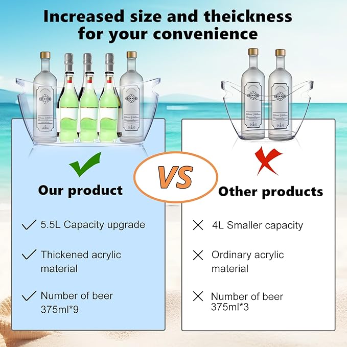 - Clear Acrylic Ice Tub: Made of high quality clear acrylic material, this champagne bucket will not rush and leak, durable for long time use. The clear ice tub can help you to check the ice and beverage inside easily.