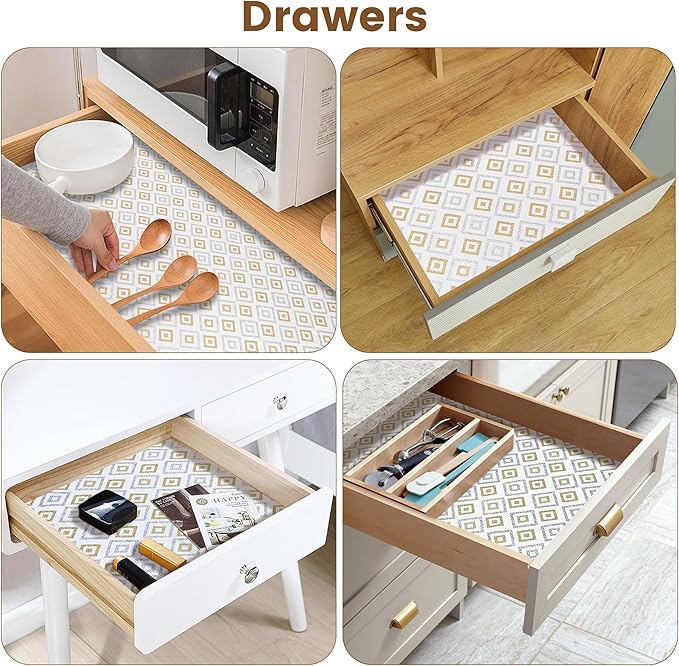 - Double-Sided Non Slip Design: Strong Grip kitchen Shelf Liner enhances the friction between shelf liners and other items. Keeps items in your kitchen cabinets,kitchen drawer,shelving,bedroom dresser drawer,toolbox drawer,bathroom,fridge,shoes shelf in place.