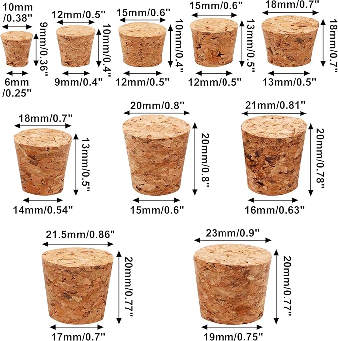 - 10 Sizes Details - There are 10 sizes of wine bottle stopper: 20pcs 0.38'x0.25'x0.36' / 10pcs 0.5'x0.4'x0.4'/ 10pcs 0.6'x0.5'x0.4'/ 10pcs 0.6'x0.5'x0.5'/ 10pcs 0.7'x0.5'x0.7'/ 10pcs 0.7'x0.54'x0.5'/ 10pcs 0.8'x0.6'x0.8'/ 10pcs 0.81x0.63'x0.78'/ 10pcs 0.86'x0.7'x0.77'/ 10pcs 0.9'x0.75'x0.77'
