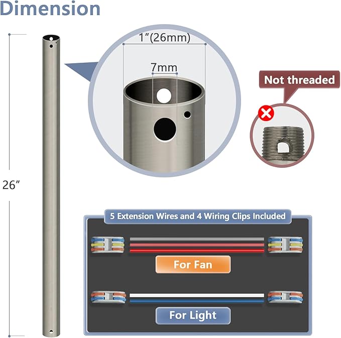 26" Ceiling Fan Downrod, 【1 Outside Diameter】 Brushed Nickel Extended Downrod, including 4 Wire Connectors and 5 Extension Wires (No Threads)