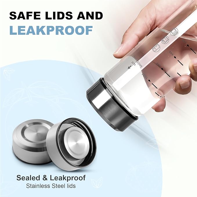 - [LEAK PROOF & AIRTIGHT STAINLESS STEEL LIDS] Our glass bottles feature airtight stainless steel lids that keep liquids securely sealed, each cap is lined with a rubber O-ring so it will never leave a leaky mess in your car or bag. Oxygen can’t get in to break down the enzymes and ruin your juices.